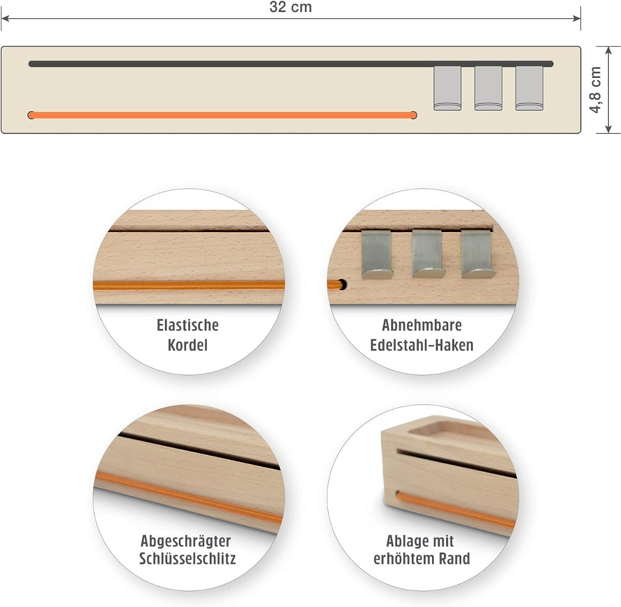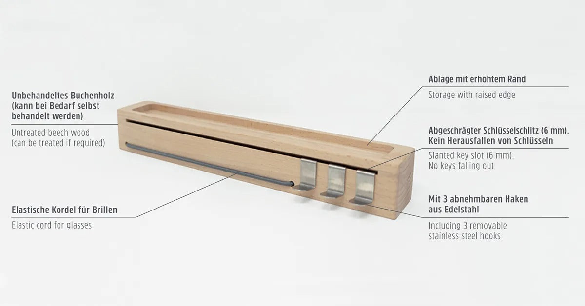Das Schlüsselbrett mon.key von Sanni Shoo überzeugt mit grossem Nutzen auf kleinem Raum. Mit den Massen 32 x 4,8 x 5 cm erfüllt es mehrere Funktionen: SCHLÜSSELHALTER UND INNOVATIVER SCHLÜSSELSCHLITZ Die Schlüsselleiste mon.key hat über die gesamte Länge (32 cm) einen Schlüsselschlitz, der (anders als andere Schlüsselboards) schräg eingearbeitet ist. Schlüssel können daher nicht herausfallen. BRILLENHALTER Suchen Sie auch öfters nach der Brille oder Sonnenbrille? Auf mon.key erhält sie endlich einen sicheren und fixen Platz. Die eingearbeitete elastische Kordel fungiert als Billen-Halterung, und ist in 3 stylischen Farben erhältlich. ABLAGE UND AUFBEWAHRUNG Schnell das Handy ablegen beim Gehen? Ein sicherer Platz für die AirPods oder andere Kopfhörer gesucht? Münzen schnell zur Hand? Mit erhöhtem Rand fungiert unsere Holzleiste perfekt als Ablage an der Wand. VOLLE FLEXIBILITÄT: EINFACHE MONTAGE UND ABNEHMNBAREN HAKEN Je nach Einsatz hält das Schlüsselbrett mon-key.me Haken aus Edelstahl bereit: Diese können für Schlüssel verwendet werden, aber auch für Dinge wie Regen-Knirps oder Hundeleine. Genauso einfach wie die Montage: Die Schlüsselleiste wird mit Bohrvorlage und 2 passenden Schrauben und Dübel geliefert.