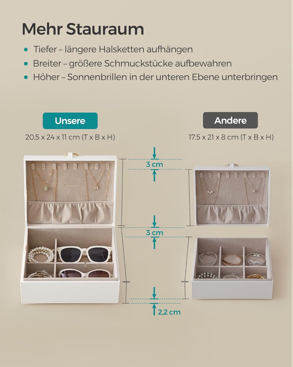 Entdecken Sie das SONGMICS Schmuckkästchen in elegantem Weiss mit goldenen Akzenten – die perfekte Kombination aus Stil und Funktionalität. Mit seinen kompakten Massen von 20,5 x 24 x 11 cm bietet dieses Schmuckkästchen nicht nur ein schickes Aussehen, sondern auch ein durchdachtes Design, das Ihre Schmuckstücke stilvoll zur Geltung bringt. Der speziell geformte Metallgriff sorgt für einen Hauch von Charakter und ermöglicht ein müheloses Öffnen und Schliessen des Deckels. Der schwebende Effekt verleiht der Box eine besondere Note und macht sie zu einem echten Blickfang in jedem Raum. Mit grosszügigem Stauraum und cleveren, getrennten Bereichen ist dieses Schmuckkästchen ideal für die Aufbewahrung Ihrer wertvollen Schätze. Haken am Deckel bieten Platz für lange Halsketten, während die untere Ebene perfekt für Sonnenbrillen ist. Ohrringe, Ohrstecker, Ringe, Uhren und Armbänder finden in den praktischen Fächern ihren eigenen Platz – alles ordentlich und griffbereit. Die durchdachten Details machen die Nutzung noch einfacher: Eine herausnehmbare Platte mit Löchern für Ohrstecker, abnehmbare Trennwände zur individuellen Aufteilung und ein Tablett mit seitlichen Griffen, das sich mühelos entnehmen lässt. Hergestellt aus strapazierfähigen MDF / Spanplatte-Platten und mit einem weichen Samt-Innenfutter ausgestattet, bietet dieses Schmuckkästchen optimalen Schutz vor Staub und Kratzern. Ob als Geschenk zum Geburtstag, Jubiläum oder einfach als kleine Aufmerksamkeit für sich selbst – das SONGMICS Schmuckkästchen ist die ideale Wahl, um Ihren Liebsten eine Freude zu bereiten oder sich selbst etwas Gutes zu tun. Gönnen Sie sich oder Ihren Freunden dieses stilvolle Schmuckkästchen und bringen Sie Ordnung in Ihre Schmuckkollektion!