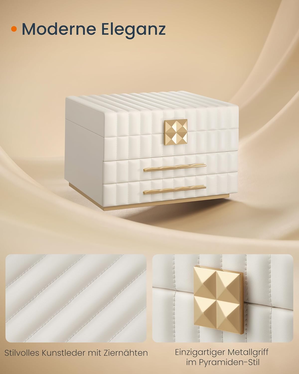 Entdecken Sie die SONGMICS HOME ANAH Kollektion – Ihr neues Schmuckkästchen, das Stil und Funktionalität perfekt vereint. Mit einer glatten, weichen PU-Oberfläche und eleganten Ziernähten setzt dieses Schmuckkästchen Akzente in jedem Raum. Der einzigartige Pyramiden-Stil der Beschläge verleiht Ihrem Schmuck eine besondere Note und macht die Aufbewahrung zu einem echten Hingucker. Mit einem durchdachten Design bietet das Schmuckkästchen reichlich Stauraum. Im Deckel finden bis zu 10 Halsketten Platz, während das obere Tablett und die zwei unteren Schubladen mit mehreren Fächern dafür sorgen, dass Ihre Ohrringe, Ringe und Armbänder ordentlich und ohne Verknoten aufbewahrt werden. Praktisch und funktional – der integrierte Spiegel ermöglicht es Ihnen, Ihr Make-up mühelos aufzutragen. Die herausnehmbaren Trennwände in der untersten Schublade und im oberen Tablett bieten Ihnen die Flexibilität, auch grössere Schmuckstücke unterzubringen. Der flexible Ohrstecker-Organizer kann zudem separat genutzt werden, um Ihre Ohrringe stilvoll zu präsentieren. Der stabile MDF / Spanplatte-Rahmen und die wasserresistente, verschleissfeste Aussenoberfläche garantieren einen Rundum-Schutz für Ihren Schmuck. Das weiche Samtfutter schützt Ihre wertvollen Stücke vor Kratzern und sorgt dafür, dass sie immer in einwandfreiem Zustand bleiben. Das elegante, wolkenweisse Design des Schmuckkästchens verleiht Ihrem Schminktisch, Schlafzimmer oder Ankleidezimmer eine dekorative Note. Es ist das perfekte Geschenk für Schmuckliebhaber, die sowohl Stil als auch Funktionalität schätzen. Machen Sie Ihre Schmuckaufbewahrung zu einem Erlebnis mit der SONGMICS HOME ANAH Kollektion!