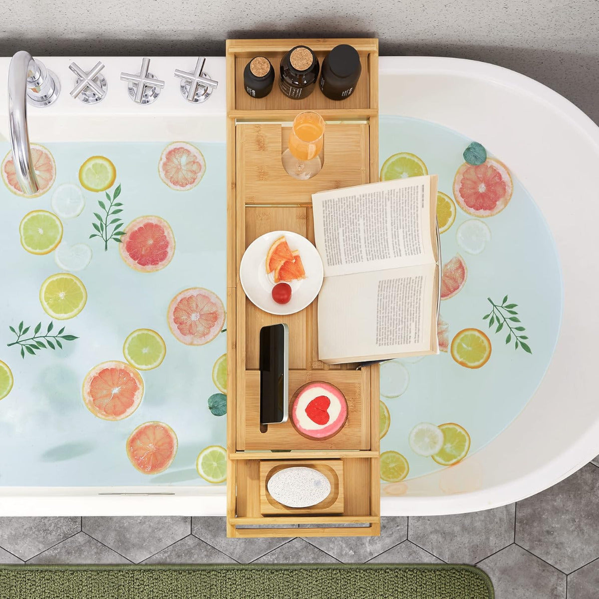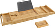 SONGMICS Badewannenablage aus Bambus – verstellbar von 75–109 cm, mit Buchstütze, Getränkehalter und Seifenschale, naturfarben Mit der SONGMICS Badewannenablage aus Bambus verwandelst du dein Badezimmer in eine kleine Wohlfühloase. Das natürliche, feuchtigkeitsresistente Material bringt Wärme und Stil in dein Zuhause, während das durchdachte Design dafür sorgt, dass du dein Badeerlebnis ganz nach deinen Wünschen gestalten kannst. Die Ablage ist ausziehbar und passt sich flexibel an verschiedene Wannenbreiten an – von 75 bis 109 cm. Dank der integrierten Halterungen für Gläser, Tassen, Tablets oder Bücher kannst du bei Kerzenschein lesen, einen Film schauen oder einfach dein Lieblingsgetränk geniessen – ganz ohne Balanceakt. Eine praktische Seifenschale sowie ein abnehmbarer Halter mit Metallbügel für Buch oder Tablet sind ebenfalls enthalten. Die rutschhemmenden Silikonpads an der Unterseite sorgen für sicheren Halt auf dem Wannenrand und schützen gleichzeitig vor Kratzern. Bei Nichtgebrauch lässt sich die Ablage platzsparend zusammenklappen oder an der Wand anlehnen. Ideal für alle, die sich nach einem langen Tag eine kleine Auszeit gönnen wollen – mit Stil, Funktion und einem Hauch Natur.
