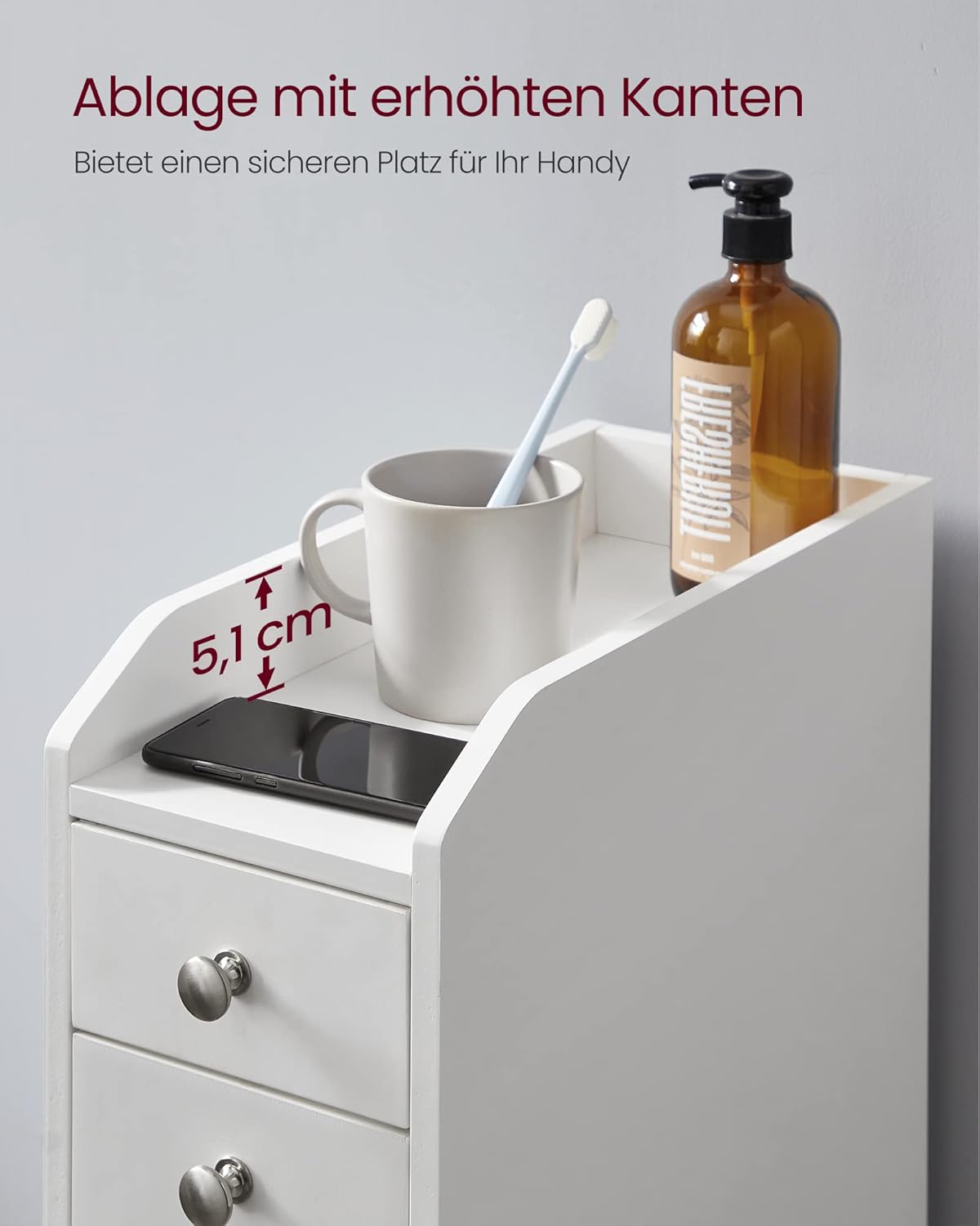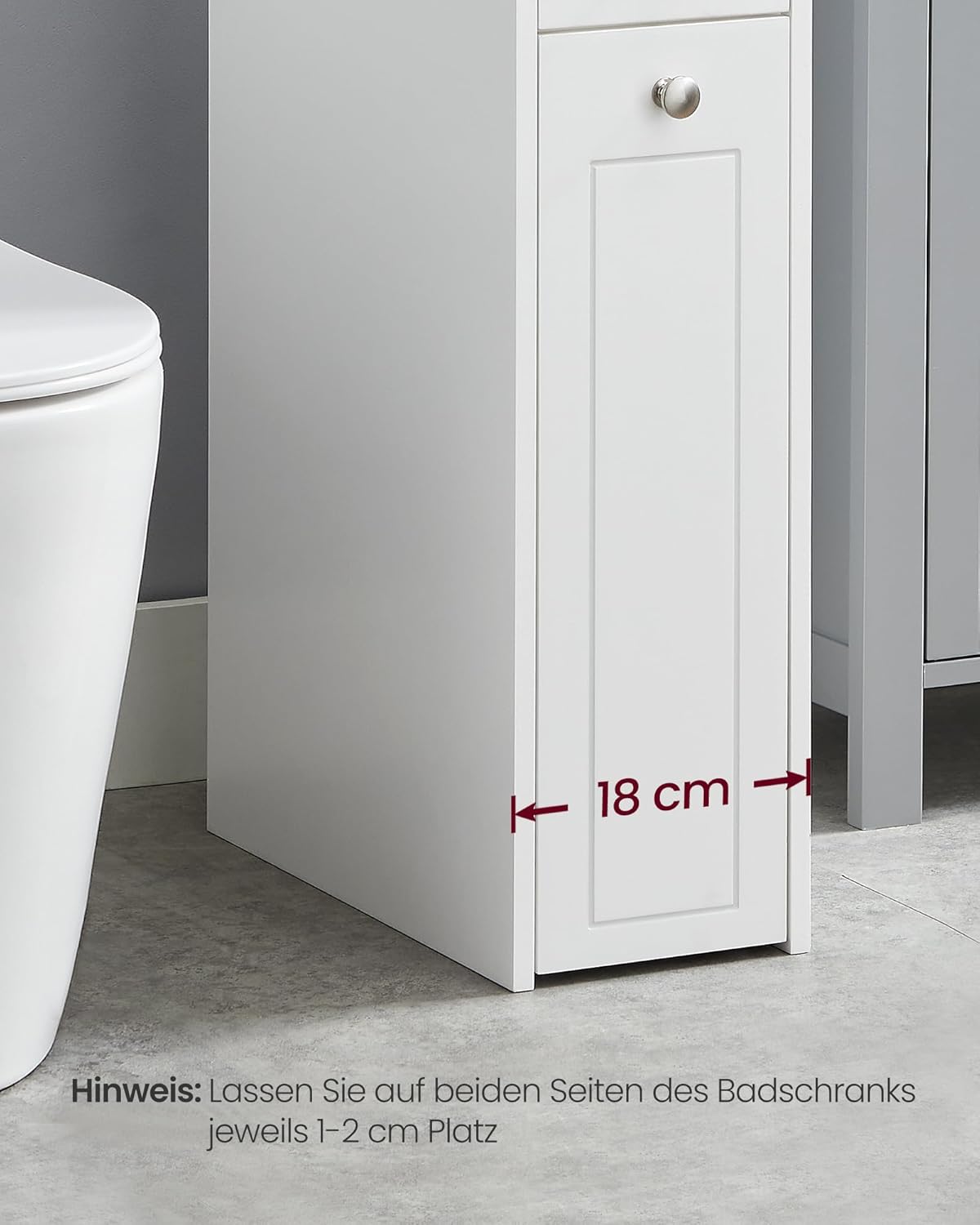 Entdecken Sie den SONGMICS Badezimmerschrank klein – die perfekte Lösung für alle, die in ihrem Badezimmer oder in der Küche zusätzlichen Stauraum schaffen möchten, ohne dabei Kompromisse bei Stil und Funktionalität einzugehen. Mit seinen kompakten Massen von 40 x 18 x 70 cm passt dieser schmale Badschrank ideal in enge Räume, sei es zwischen Toilette und Wand oder zwischen anderen Schränken. Der Schrank bietet durchdachten Stauraum auf 4 Ebenen. Die untere Schublade ist mit zwei Ablagen ausgestattet – ideal für Toilettenpapier und andere Utensilien. Die obere Schublade eignet sich perfekt für kleine Gegenstände, während die oberste Regalebene einen praktischen Platz für Ihr Handy bietet. So haben Sie alles Wichtige stets griffbereit. Ein besonderes Highlight ist die untere Schublade mit Rollen, die sanft herausgleitet und Ihnen den Zugriff auf Ihre Dinge erleichtert. Die integrierte Platte verhindert zudem, dass die Schublade herausfällt, was für zusätzliche Sicherheit sorgt. Hergestellt aus hochwertigem MDF / Spanplatte, ist dieser Nischenschrank nicht nur stabil und langlebig, sondern auch mit einem Kippschutz ausgestattet, der für eine sichere Nutzung sorgt. Egal, ob Sie ihn im Badezimmer oder in der Küche einsetzen – der SONGMICS Badezimmerschrank ist ein zuverlässiger Mehrzweckschrank, der Ihnen hilft, Ordnung zu halten. Die Montage gestaltet sich dank der klar verständlichen Anleitung und der gekennzeichneten Teile kinderleicht. Verleihen Sie Ihrem Raum mit diesem stilvollen und funktionalen Aufbewahrungsschrank den letzten Schliff!
