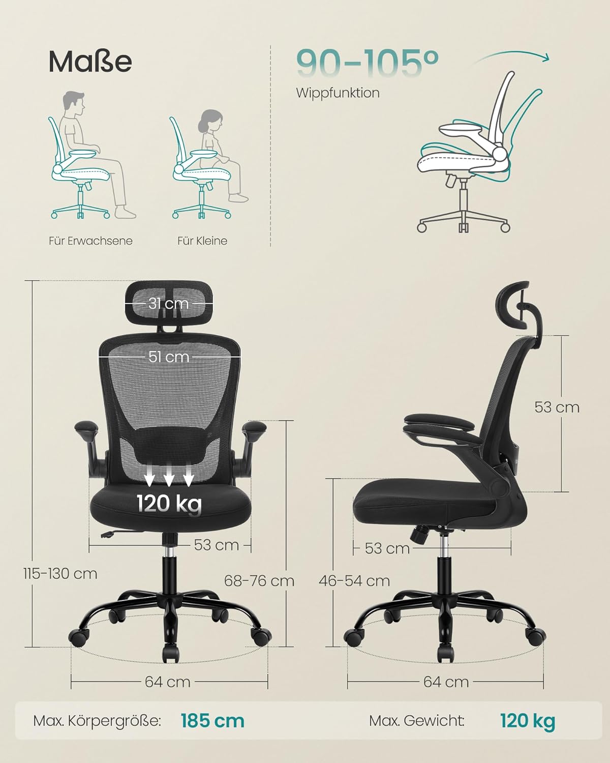 Ergonomische S‑förmige Rückenlehne mit höhenverstellbarer Lenden- und Kopfstütze, Verstellbare Sitzhöhe 46–54 cm mit Wippfunktion 90–105°, Klappbare Armlehnen und atmungsaktives Netz für langanhaltenden Komfort