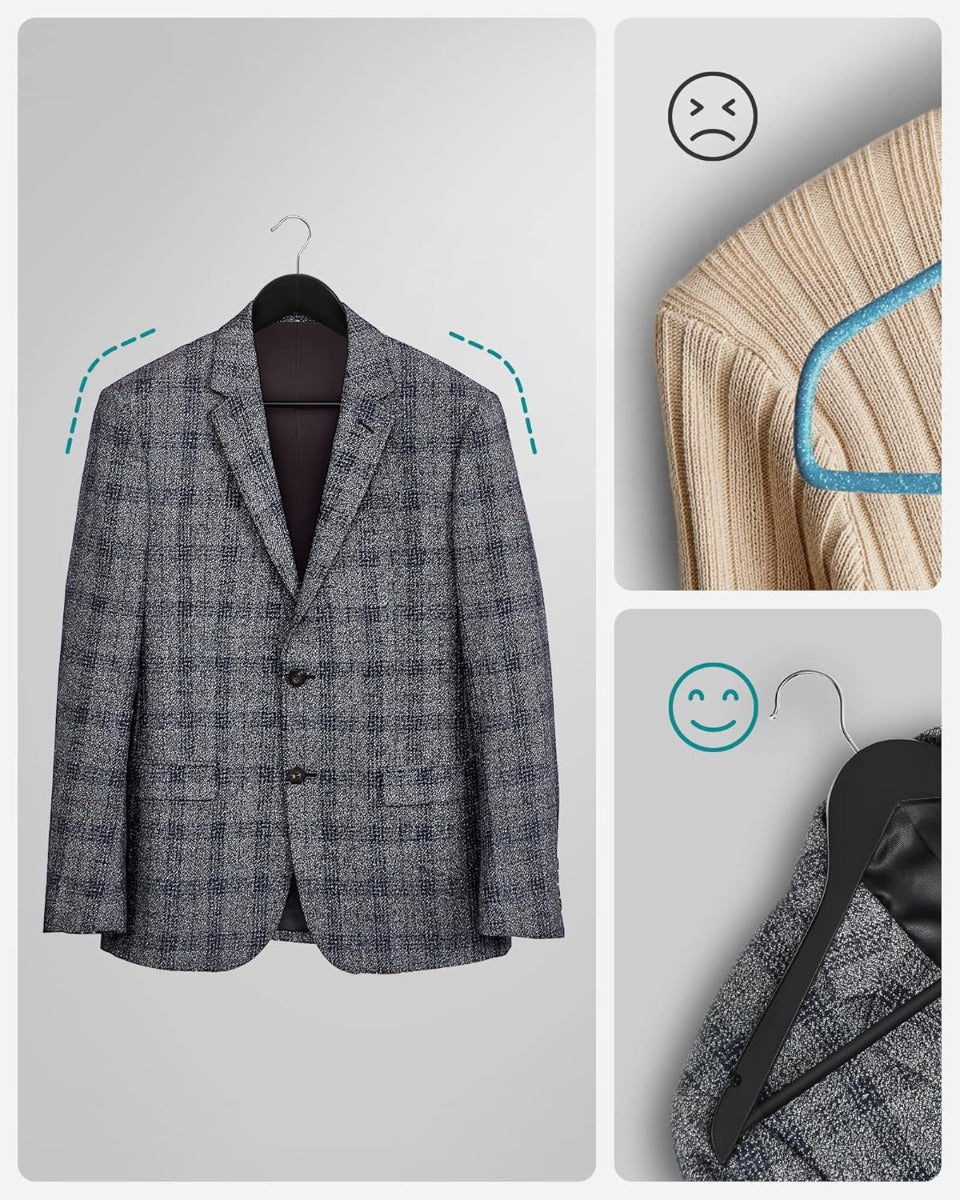 SONGMICS 10er Set Holzbügel – schwarz lackiert, mit Rockkerben & rutschfestem Hosensteg, 360° drehbarer Haken – Kleiderbügel aus Massivholz für Jacken, Anzüge & Hemden Die SONGMICS Holzbügel im praktischen Set verbinden hochwertige Verarbeitung mit funktionalem Design. Gefertigt aus massivem Holz und veredelt mit einer hochwertigen Lackierung, sorgen sie für eine stilvolle Optik im Kleiderschrank und halten deine Kleidung stets in Form. Praktische Einkerbungen an den Schultern ermöglichen ein sicheres Aufhängen von Kleidungsstücken mit Trägern – wie Tops, Kleider oder feinen Blusen. Der stabile Hosensteg ist mit einer rutschfesten Ummantelung versehen, sodass auch Hosen, Schals oder Röcke sicher an Ort und Stelle bleiben. Der 360° drehbare Haken aus verchromtem Metall erleichtert dir das Einhängen aus jedem Winkel – besonders praktisch bei beengtem Platz. Die Bügel sind nicht nur optisch ein Highlight, sondern auch funktional besonders robust. Sie eignen sich hervorragend für Anzüge, Jacken, Hemden oder Mäntel und bringen Ordnung und Eleganz in deine Garderobe – ganz gleich, ob im privaten Ankleidezimmer, im Hotel oder in der Boutique. SONGMICS Holzbügel stehen für Stabilität, Stil und zuverlässige Aufbewahrung auf hohem Niveau.