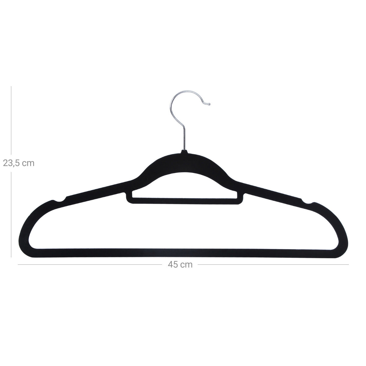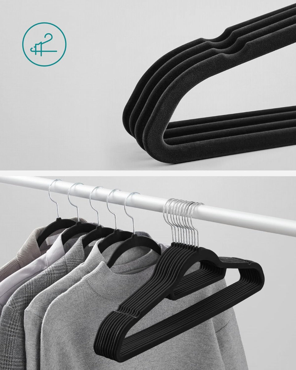 SONGMICS 20er Set Samt-Kleiderbügel – platzsparend, 360° drehbarer Haken, U-förmige Öffnung, 41,5 cm breit – Silber-Schwarz, rutschfest & formschonend für Alltag & Business Die SONGMICS Samt-Kleiderbügel im praktischen Set vereinen elegantes Design mit cleverer Funktionalität. Ihre samtige Oberfläche sorgt für rutschfesten Halt – selbst bei feinen Stoffen – und schützt gleichzeitig die Form deiner Kleidung. Dank der geschwungenen Schulterpartien entstehen keine Druckstellen, während die U-förmige Aussparung das Aufhängen von Kleidungsstücken mit engem Kragen erleichtert. Mit nur 0,5 cm Dicke sind die Bügel besonders platzsparend und helfen dir, den Stauraum im Schrank optimal zu nutzen. Jeder Bügel ist robust genug, um bis zu 5 kg zu tragen – ideal auch für schwerere Kleidungsstücke wie Jacken oder Pullover. Der um 360° drehbare Haken aus Metall sorgt für zusätzliche Flexibilität beim Aufhängen, unabhängig davon, wie deine Garderobe organisiert ist. Ein integrierter Mittelsteg bietet zudem Platz für Accessoires wie Schals oder Krawatten. Das Set wird sicher verpackt geliefert und ist sowohl im privaten als auch im gewerblichen Bereich vielseitig einsetzbar – etwa in Hotels, Boutiquen oder Ankleidezimmern. Die neutrale Farbe passt sich jeder Einrichtung an und verleiht deinem Kleiderschrank ein aufgeräumtes, einheitliches Erscheinungsbild. Die SONGMICS Samt-Kleiderbügel sind eine zuverlässige Lösung für alle, die Wert auf Ordnung, Langlebigkeit und dezente Eleganz legen.