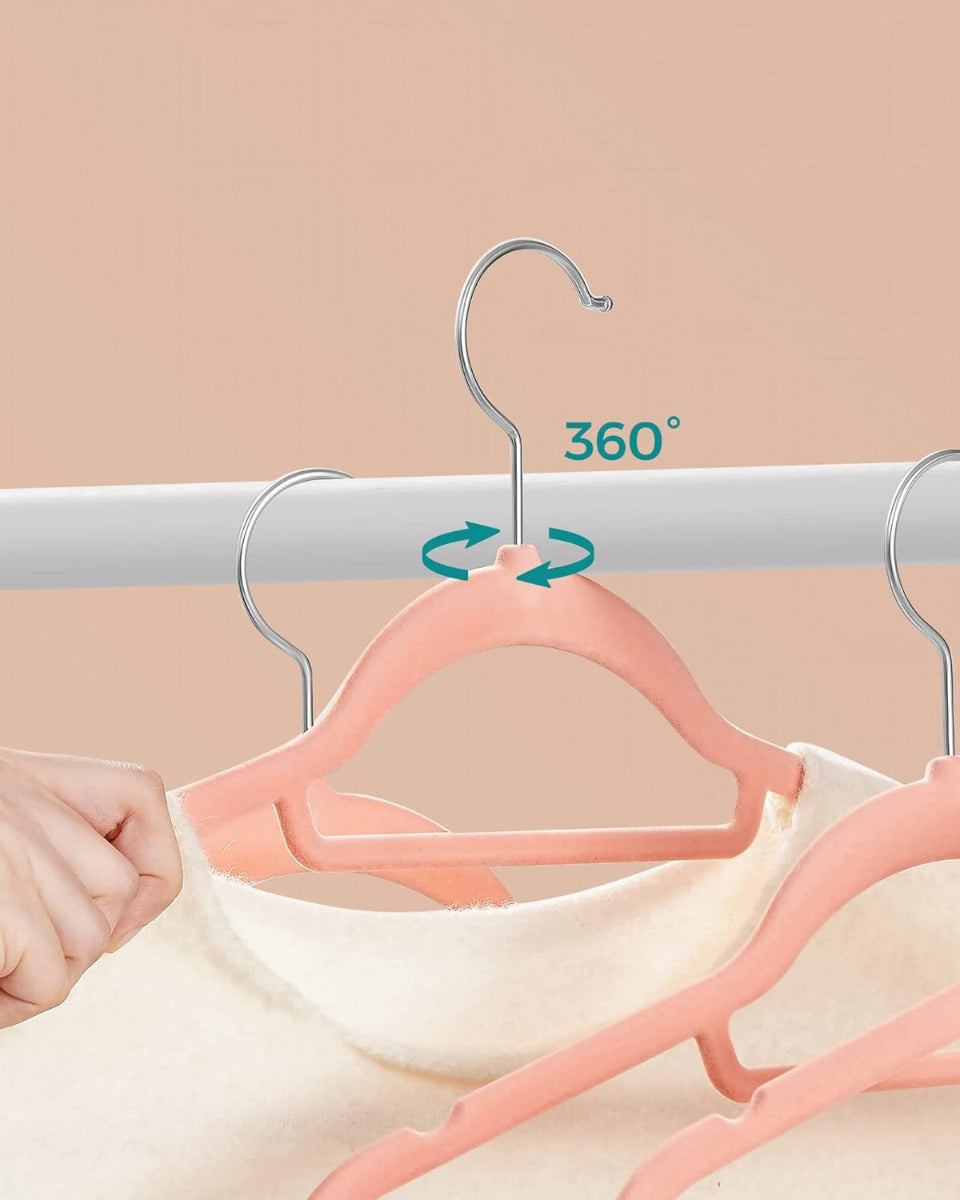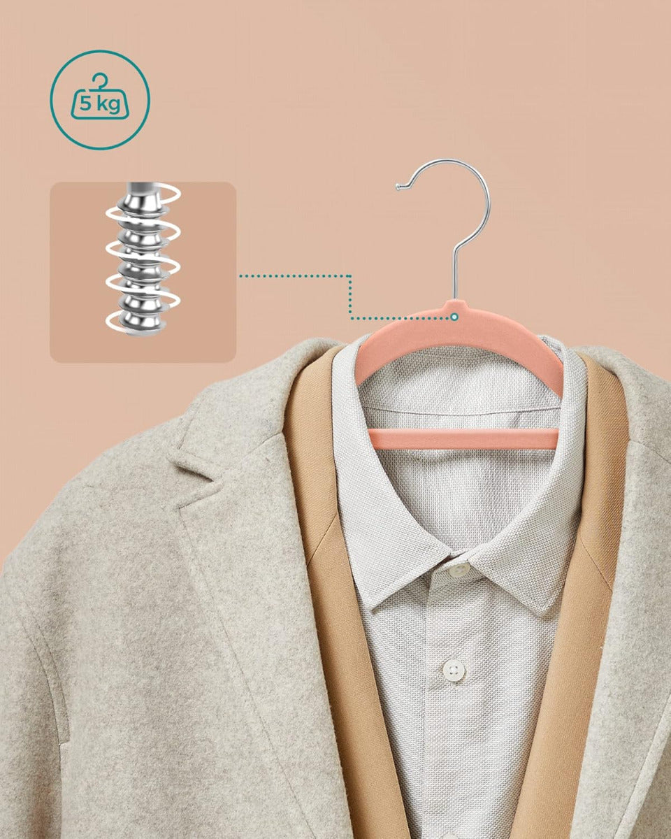 SONGMICS 50er Set Samt-Kleiderbügel – platzsparend, 360° drehbarer Haken, U-förmige Öffnung, 41,5 cm breit – hellrosa, rutschfest & formschonend für Alltag & Business Die SONGMICS Samt-Kleiderbügel im praktischen Set vereinen elegantes Design mit cleverer Funktionalität. Ihre samtige Oberfläche sorgt für rutschfesten Halt – selbst bei feinen Stoffen – und schützt gleichzeitig die Form deiner Kleidung. Dank der geschwungenen Schulterpartien entstehen keine Druckstellen, während die U-förmige Aussparung das Aufhängen von Kleidungsstücken mit engem Kragen erleichtert. Mit nur 0,5 cm Dicke sind die Bügel besonders platzsparend und helfen dir, den Stauraum im Schrank optimal zu nutzen. Jeder Bügel ist robust genug, um bis zu 5 kg zu tragen – ideal auch für schwerere Kleidungsstücke wie Jacken oder Pullover. Der um 360° drehbare Haken aus Metall sorgt für zusätzliche Flexibilität beim Aufhängen, unabhängig davon, wie deine Garderobe organisiert ist. Ein integrierter Mittelsteg bietet zudem Platz für Accessoires wie Schals oder Krawatten. Das Set wird sicher verpackt geliefert und ist sowohl im privaten als auch im gewerblichen Bereich vielseitig einsetzbar – etwa in Hotels, Boutiquen oder Ankleidezimmern. Die neutrale Farbe passt sich jeder Einrichtung an und verleiht deinem Kleiderschrank ein aufgeräumtes, einheitliches Erscheinungsbild. Die SONGMICS Samt-Kleiderbügel sind eine zuverlässige Lösung für alle, die Wert auf Ordnung, Langlebigkeit und dezente Eleganz legen.