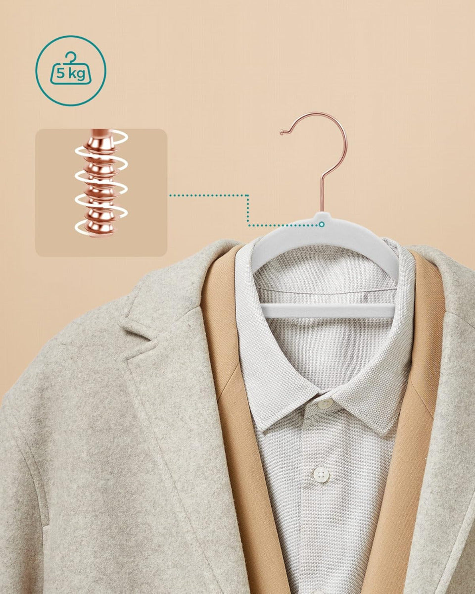 SONGMICS 50er Set Samt-Kleiderbügel – platzsparend, 360° drehbarer Haken, U-förmige Öffnung, 41,5 cm breit – Roségold-Weiss, rutschfest & formschonend für Alltag & Business Die SONGMICS Samt-Kleiderbügel im praktischen Set vereinen elegantes Design mit cleverer Funktionalität. Ihre samtige Oberfläche sorgt für rutschfesten Halt – selbst bei feinen Stoffen – und schützt gleichzeitig die Form deiner Kleidung. Dank der geschwungenen Schulterpartien entstehen keine Druckstellen, während die U-förmige Aussparung das Aufhängen von Kleidungsstücken mit engem Kragen erleichtert. Mit nur 0,5 cm Dicke sind die Bügel besonders platzsparend und helfen dir, den Stauraum im Schrank optimal zu nutzen. Jeder Bügel ist robust genug, um bis zu 5 kg zu tragen – ideal auch für schwerere Kleidungsstücke wie Jacken oder Pullover. Der um 360° drehbare Haken aus Metall sorgt für zusätzliche Flexibilität beim Aufhängen, unabhängig davon, wie deine Garderobe organisiert ist. Ein integrierter Mittelsteg bietet zudem Platz für Accessoires wie Schals oder Krawatten. Das Set wird sicher verpackt geliefert und ist sowohl im privaten als auch im gewerblichen Bereich vielseitig einsetzbar – etwa in Hotels, Boutiquen oder Ankleidezimmern. Die neutrale Farbe passt sich jeder Einrichtung an und verleiht deinem Kleiderschrank ein aufgeräumtes, einheitliches Erscheinungsbild. Die SONGMICS Samt-Kleiderbügel sind eine zuverlässige Lösung für alle, die Wert auf Ordnung, Langlebigkeit und dezente Eleganz legen.