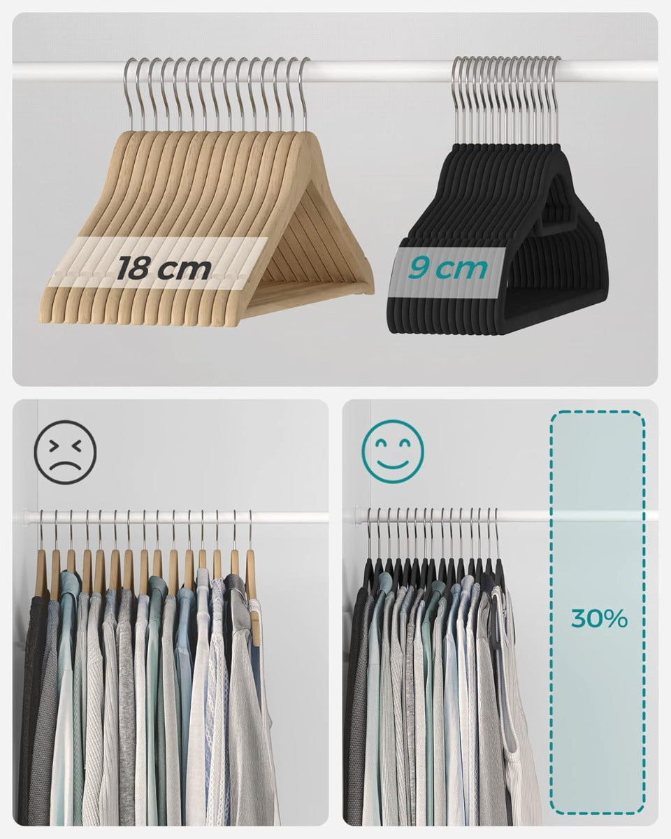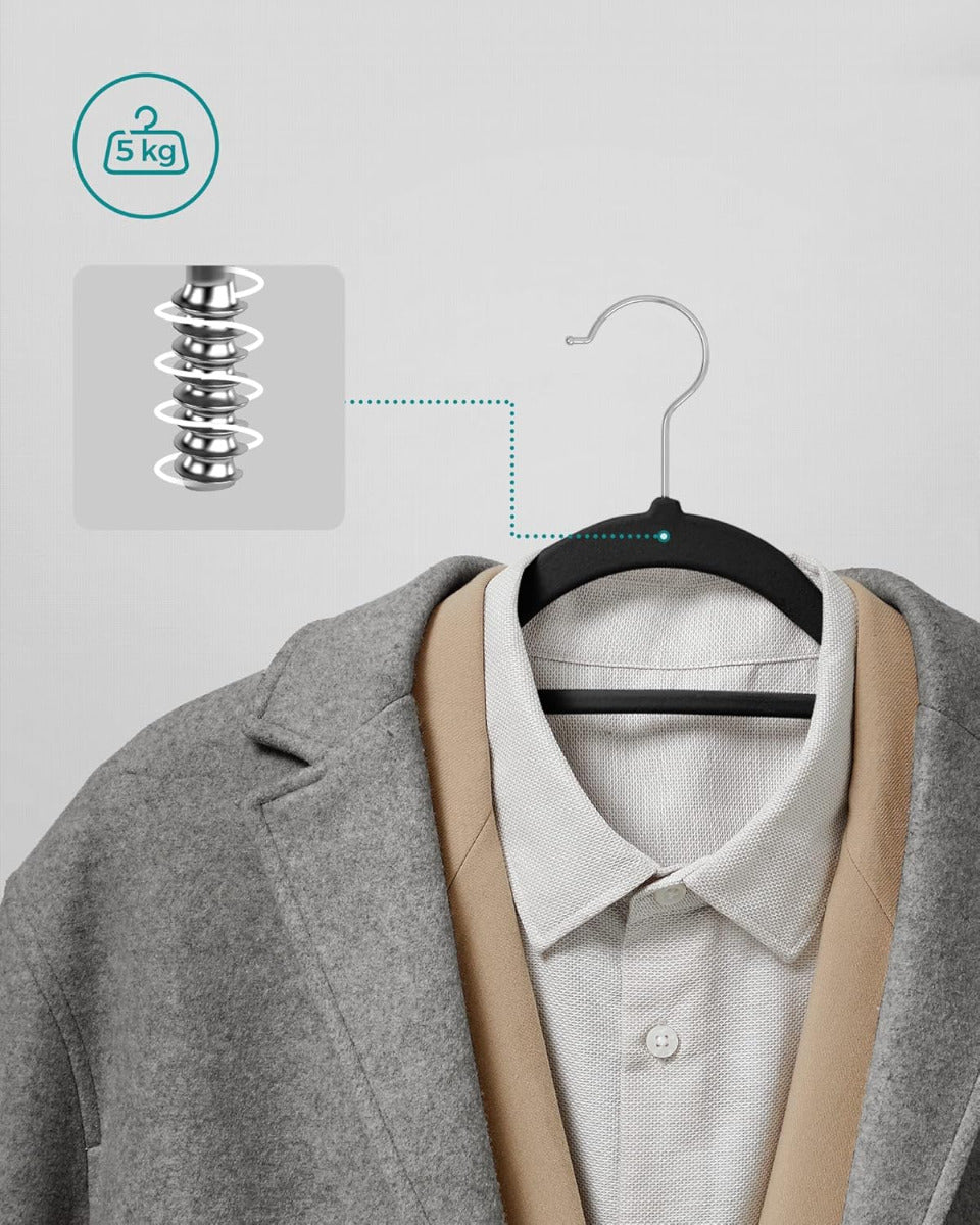 SONGMICS 50er Set Samt-Kleiderbügel – platzsparend, 360° drehbarer Haken, U-förmige Öffnung, 41,5 cm breit – schwarz, rutschfest & formschonend für Alltag & Business Die SONGMICS Samt-Kleiderbügel im praktischen Set vereinen elegantes Design mit cleverer Funktionalität. Ihre samtige Oberfläche sorgt für rutschfesten Halt – selbst bei feinen Stoffen – und schützt gleichzeitig die Form deiner Kleidung. Dank der geschwungenen Schulterpartien entstehen keine Druckstellen, während die U-förmige Aussparung das Aufhängen von Kleidungsstücken mit engem Kragen erleichtert. Mit nur 0,5 cm Dicke sind die Bügel besonders platzsparend und helfen dir, den Stauraum im Schrank optimal zu nutzen. Jeder Bügel ist robust genug, um bis zu 5 kg zu tragen – ideal auch für schwerere Kleidungsstücke wie Jacken oder Pullover. Der um 360° drehbare Haken aus Metall sorgt für zusätzliche Flexibilität beim Aufhängen, unabhängig davon, wie deine Garderobe organisiert ist. Ein integrierter Mittelsteg bietet zudem Platz für Accessoires wie Schals oder Krawatten. Das Set wird sicher verpackt geliefert und ist sowohl im privaten als auch im gewerblichen Bereich vielseitig einsetzbar – etwa in Hotels, Boutiquen oder Ankleidezimmern. Die neutrale Farbe passt sich jeder Einrichtung an und verleiht deinem Kleiderschrank ein aufgeräumtes, einheitliches Erscheinungsbild. Die SONGMICS Samt-Kleiderbügel sind eine zuverlässige Lösung für alle, die Wert auf Ordnung, Langlebigkeit und dezente Eleganz legen.