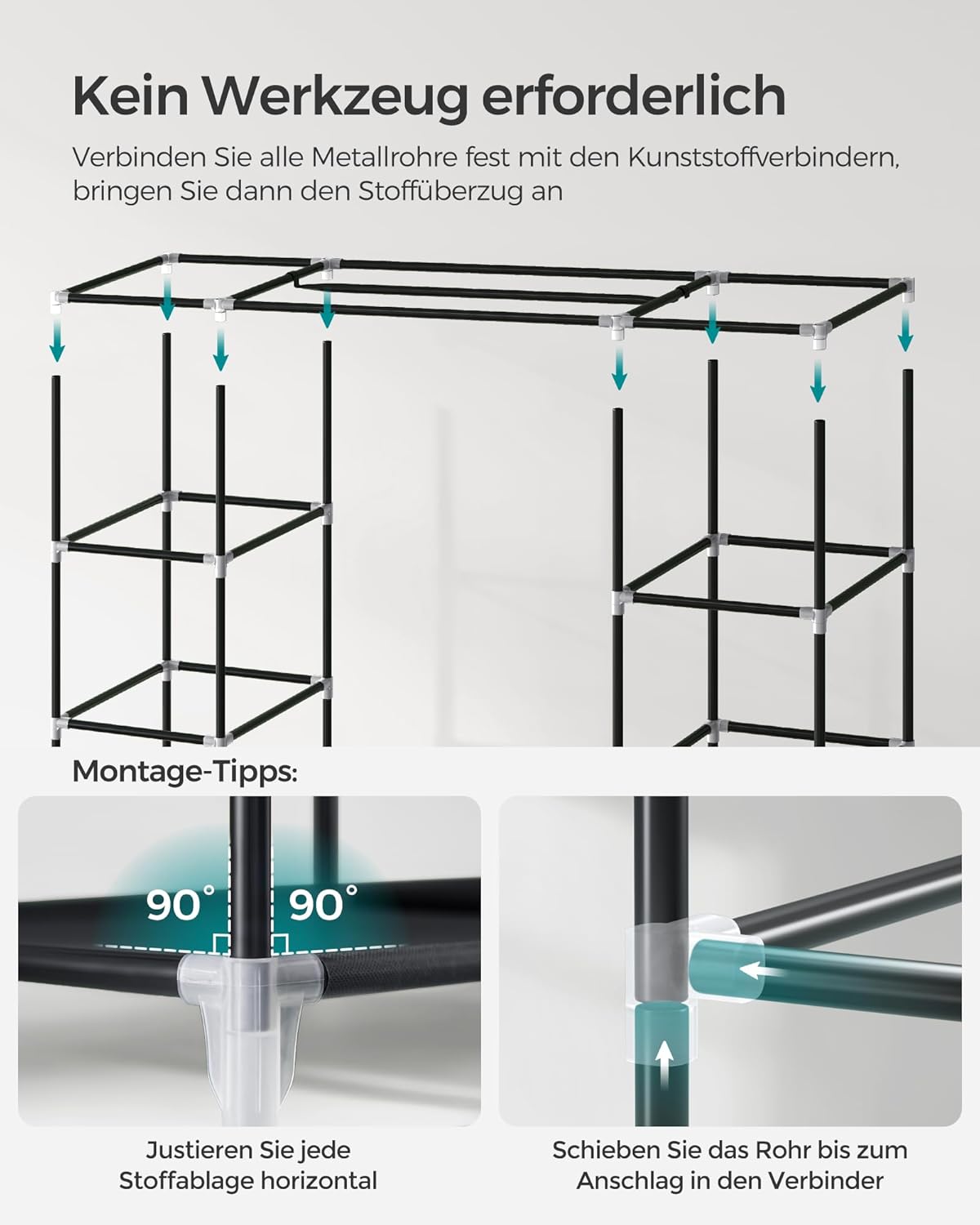 Großer Stauraum mit flexibler Kleiderstange und 12 belastbaren Ablagen, Stabile Metallrohr-Konstruktion für lange Haltbarkeit, Staubschutz durch Vliesüberzug mit Reißverschluss und einfache Steckmontage