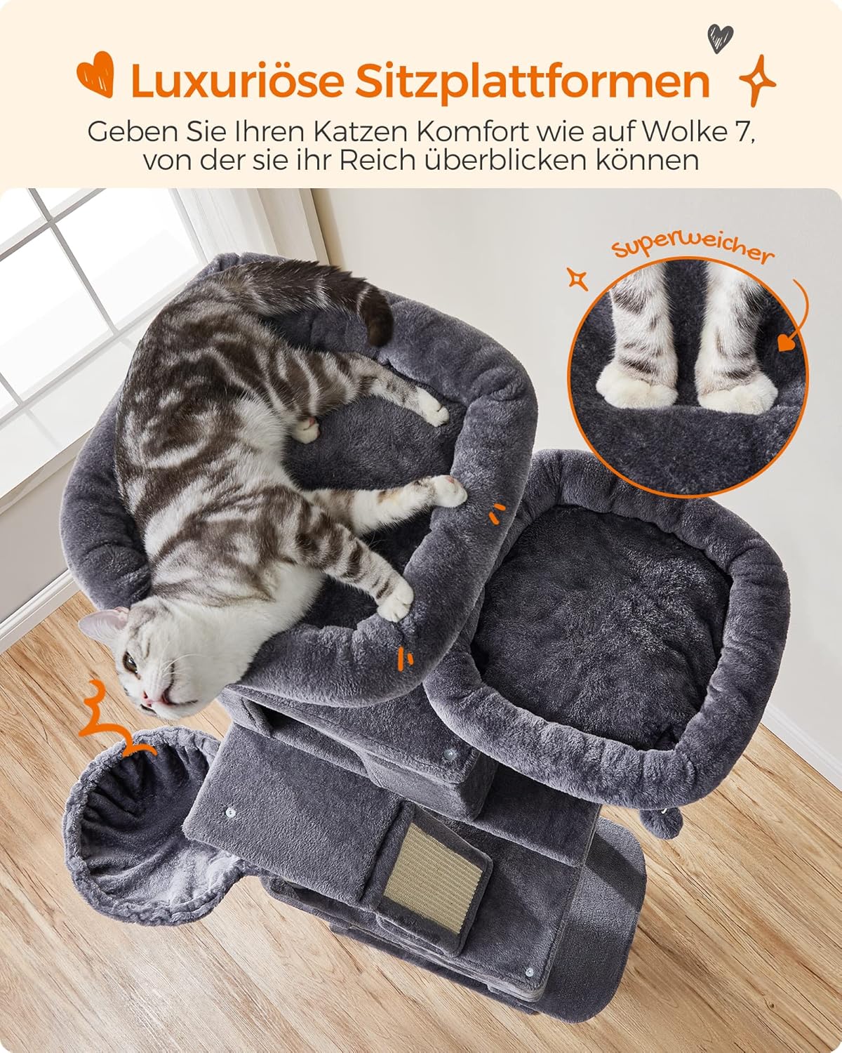 Entdecken Sie den Feandrea Kratzbaum XXL – den ultimativen Spielplatz für Ihre Katzen! Mit einer beeindruckenden Höhe von 206 cm bietet dieser mehrstöckige Katzenbaum endlosen Kletterspass und ist perfekt für abenteuerlustige Stubentiger. Die fünf Stufen mit kurzen Abständen von 30-40 cm erleichtern das Auf- und Absteigen, sodass selbst die kleinsten Kätzchen und älteren Katzen problemlos ihre Höhenliebe ausleben können. Der Feandrea Kratzbaum ist ein wahres All-in-One Paradies: Ausgestattet mit zwei gut gepolsterten Plattformen, zwei kuscheligen Höhlen, einem flauschigen Korb, zwei Plüschbällen und einer Hängematte findet jede Katze ihren Lieblingsplatz. Ideal für Haushalte mit mehreren Katzen, sorgt dieser Katzenbaum für stundenlangen Spielspass und Entspannung. Sicherheit und Stabilität stehen an erster Stelle. Dank der hochwertigen Spanplatten, einer grossen Basis mit verstärkten Bodenleisten und einem Kippschutz ist dieser Kratzbaum für bis zu sechs grosse Katzen (jeweils bis zu 7 kg) geeignet. Ihre Katzen können unbesorgt toben und spielen. Die 13 Kratzsäulen und die Kratzrampe aus Sisalseil bieten Ihren Katzen die perfekte Möglichkeit, ihre Kratzbedürfnisse auszuleben und Ihr Sofa zu schonen. Die Kratzrampe ist besonders hilfreich für Kätzchen und ältere Katzen, die Unterstützung beim Klettern benötigen. Der Aufbau des Feandrea Kratzbaums gestaltet sich dank der klaren Anleitung und der gekennzeichneten Teile kinderleicht. Und wenn es um die Reinigung geht, brauchen Sie sich keine Sorgen zu machen: Haare, Schmutz und Krümel lassen sich mühelos mit einer Fusselrolle oder einem Staubsauger entfernen. Sollte der Spieltrieb Ihrer Katzen die Plüschbälle etwas zu wild werden lassen, sind zwei Ersatz-Plüschbälle im Lieferumfang enthalten. So können Sie jederzeit für Nachschub sorgen und den Spielspass aufrechterhalten. Gönnen Sie Ihren Katzen den Feandrea Kratzbaum XXL – ein Ort, an dem sie spielen, entspannen und sich wohlfühlen können!