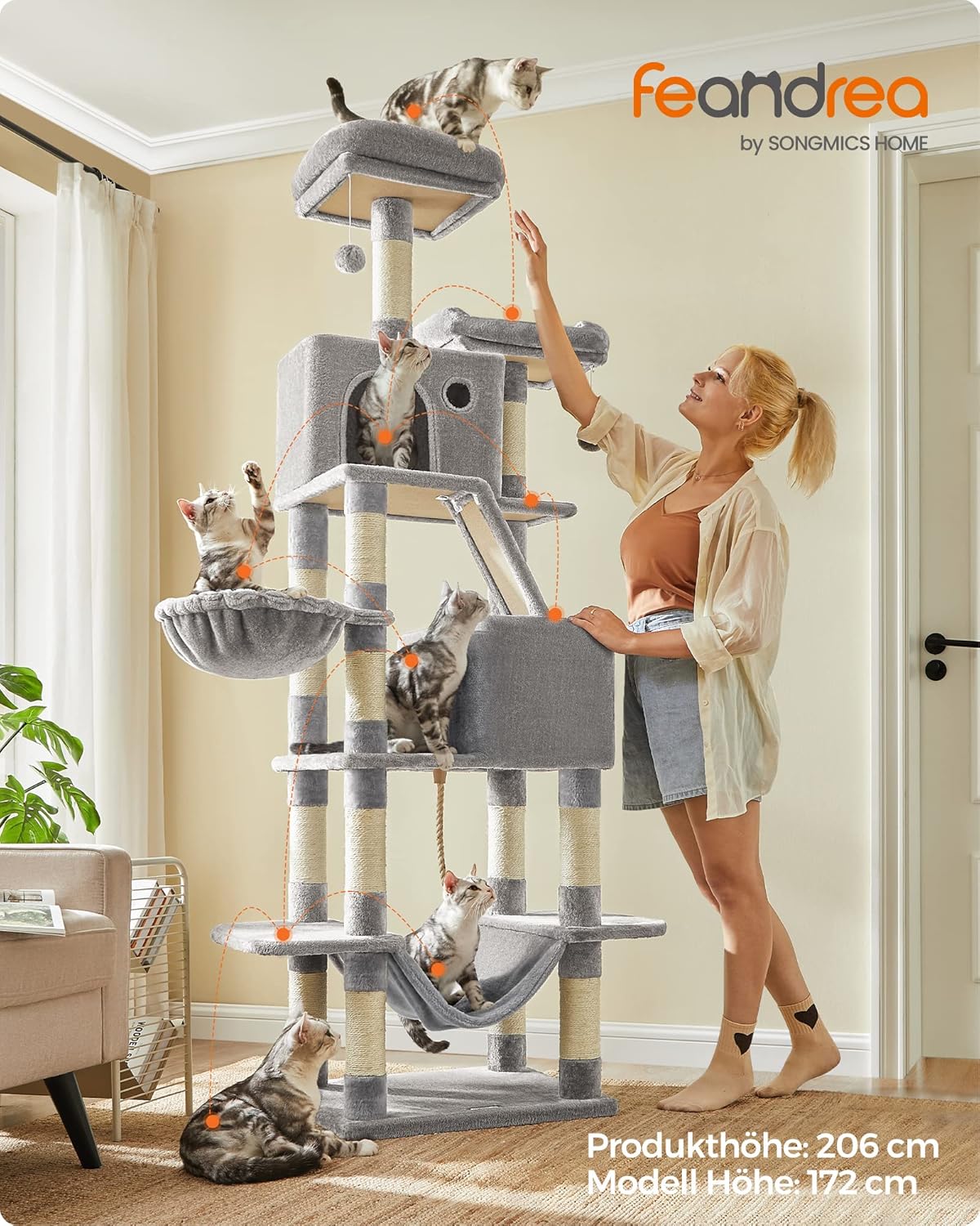 206 cm hoher Kletter- und Spielturm für ausgiebiges Klettern, Mehrstöckiges Ruhe- und Versteckparadies mit Höhlen, Plattformen und Hängematte, Robuste, kippsichere Konstruktion mit 13 Sisal-Kratzsäulen