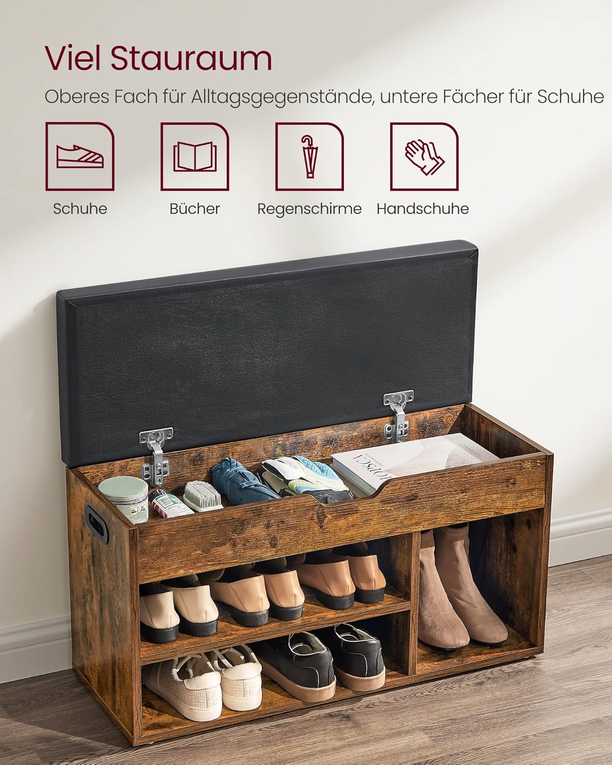 Kunden begeistern vor allem das stilvolle vintagebraune Design kombiniert mit hoher Funktionalität. Geschätzt werden der großzügige Stauraum für Schuhe und Accessoires, das bequeme, dick gepolsterte Sitzkissen, die robuste Verarbeitung (bis 136 kg), pflegeleichter PU-Bezug sowie die praktischen Griffe und rutschfesten Fußpads für einfachen Transport und sicheren Halt.