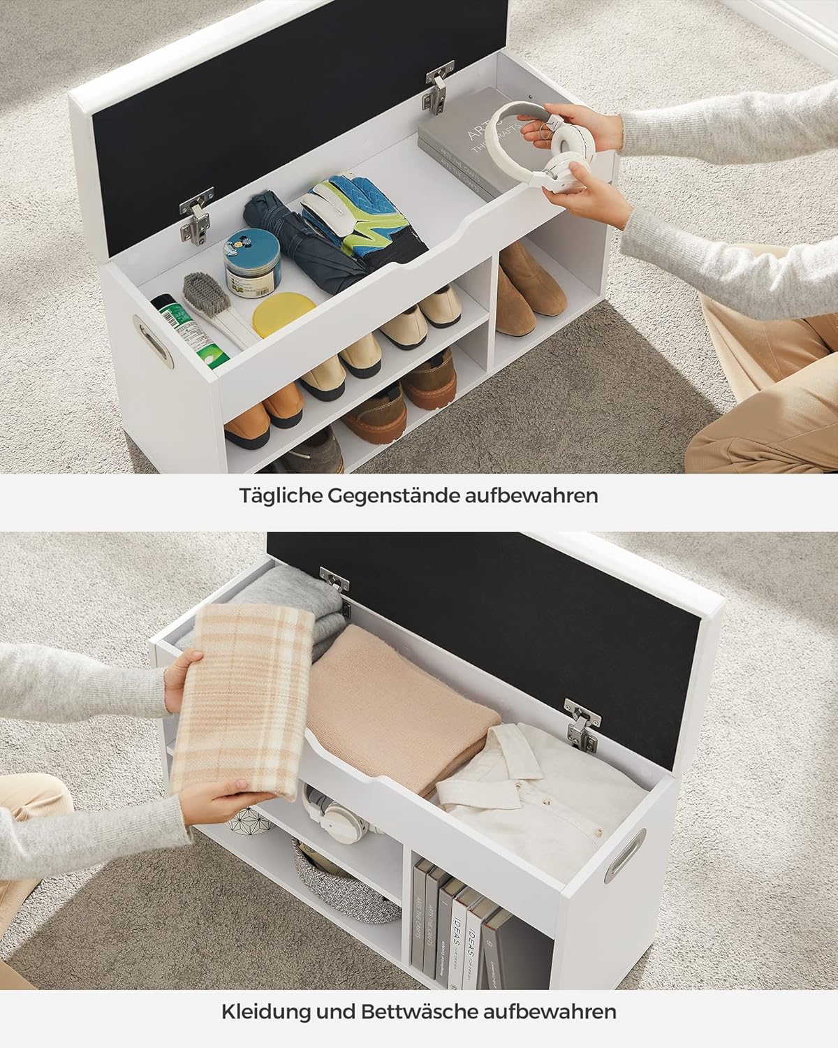 Platziert bis zu 7 Paar Schuhe, zusätzliches 7 cm Fach für Handschuhe und Kleinteile, Robuste Tragfähigkeit bis 136 kg mit rutschfesten Füßen, Bequeme 5 cm Polsterung mit pflegeleichtem PU-Bezug