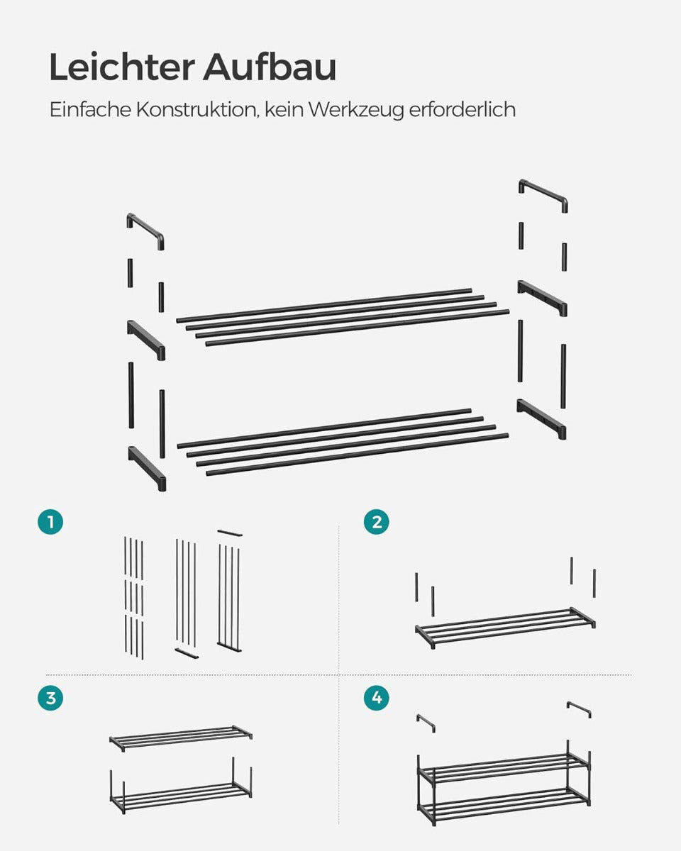 SONGMICS Schuhregal – 2 Ebenen, stapelbar, für 12–15 Paar Schuhe, Metall & Kunststoff, 30 × 92 × 34 cm, schwarz Das SONGMICS Schuhregal mit 2 Ebenen ist die ideale Lösung, um Ordnung im Eingangsbereich, Flur oder Schlafzimmer zu schaffen. Es überzeugt durch seine Flexibilität: Es kann klassisch aufrecht aufgestellt, umgedreht für zusätzlichen Stauraum darunter verwendet oder mit einem zweiten Regal stapelbar kombiniert werden. Mit seinen kompakten Massen von 30 × 92 × 34 cm bietet das Regal Platz für bis zu 15 Paar Schuhe – je nach Grösse. Dank des optimalen Abstands zwischen den Ebenen passen auch Stiefeletten oder Sportschuhe problemlos hinein. Die Kombination aus robusten, lackierten Metallrohren und stabilen Kunststoffverbindern sorgt für gute Belastbarkeit (bis zu 10 kg pro Ebene) und Langlebigkeit. Besonders praktisch: Für den Aufbau sind keine Werkzeuge nötig – einfach zusammenstecken, fertig! Die pflegeleichte Oberfläche lässt sich schnell mit einem feuchten Tuch reinigen, was das Regal auch bei täglicher Nutzung pflegeleicht macht. Produktdetails: Farbe: Schwarz Material: Metallrohre, Kunststoffverbinder Grösse: 30 x 92 x 34 cm (T x B x H) Gewicht: 0,8 kg Max. statische Belastbarkeit pro Ebene: 10 kg Max. statische Belastbarkeit insgesamt: 20 kg Lieferumfang: 1 x Schuhregal mit 2 Ebenen 1 x Anleitung SONGMICS Hinweise: Kindern ist es aus Sicherheitsgründen untersagt, auf das Metallregal zu klettern oder damit zu spielen. Nutzen Sie dieses Steckregal nicht im Aussenbereich.