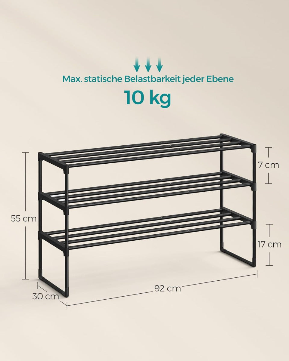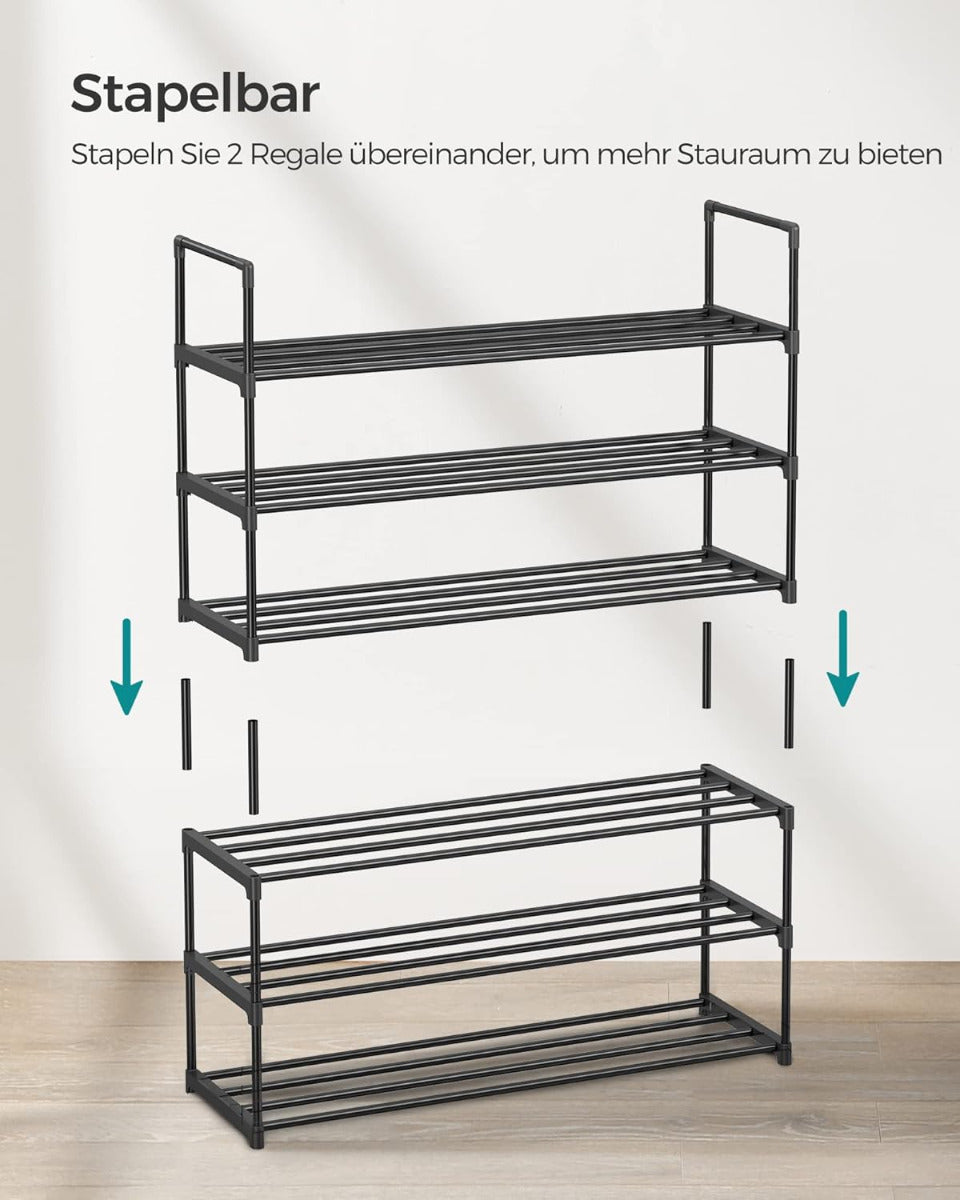 SONGMICS Schuhregal mit 3 Ebenen – stapelbar, flexibel einsetzbar, für bis zu 20 Paar Schuhe, 92 × 30 × 55 cm, Schwarz Das SONGMICS Schuhregal mit 3 Ebenen überzeugt durch Flexibilität, Stabilität und schlichtes Design. Mit seinen kompakten Massen von 92 × 30 × 55 cm eignet es sich ideal für den Einsatz im Eingangsbereich, im Schlafzimmer oder in der Ankleide. Je nach Schuhgrösse finden bis zu 20 Paar Schuhe Platz – bei Herrenschuhen rund 16 Paar. Das Regal kann klassisch aufrecht, umgedreht für zusätzlichen Stauraum darunter oder stapelbar mit weiteren Einheiten verwendet werden. Die verstärkten Metallrohre und hochwertigen Kunststoffverbinder garantieren Stabilität und Belastbarkeit – jede Ebene trägt bis zu 10 kg. Der werkzeugfreie Aufbau gelingt schnell und einfach per Stecksystem. Dank der beschichteten Oberfläche lässt sich das Regal zudem mühelos mit einem feuchten Tuch reinigen. Ob Sneaker, Slipper oder Kinderschuhe – hier findet jedes Paar seinen Platz.