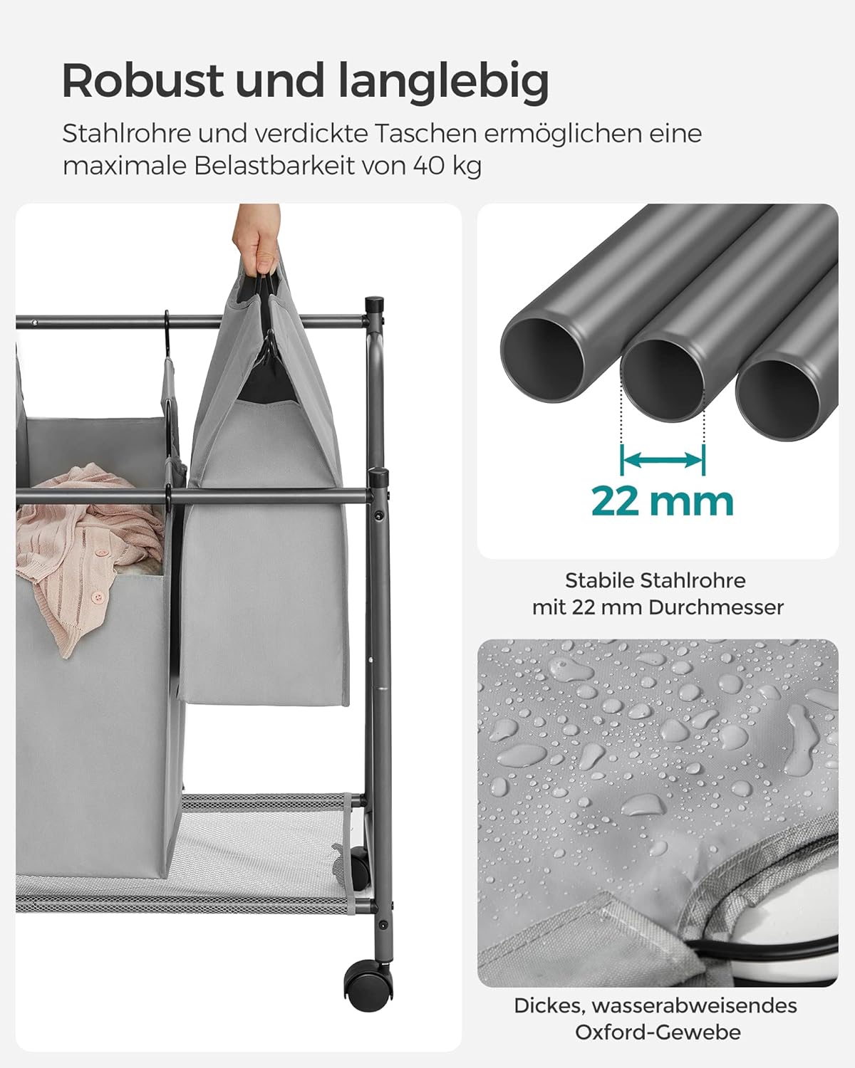 Entdecken Sie den SONGMICS Wäschekorb – die perfekte Lösung für Ihre Wäscheorganisation! Mit einem beeindruckenden Volumen von 140 Litern bietet dieser Wäschesammler ausreichend Platz, um Ihre gesamte schmutzige Wäsche ordentlich zu verstauen. Nie wieder wird Ihre Kleidung auf dem Boden landen! Dank der 4 abnehmbaren Stofftaschen wird das Sortieren Ihrer Wäsche zum Kinderspiel. Ob nach Farben oder Materialien – mit diesem Wäschesortierer haben Sie alles im Griff und sparen wertvolle Zeit an Waschtagen. Die Mobilität dieses Wäschekorbs ist ein weiteres Highlight. Ausgestattet mit stabilen Stangen und 4 Rollen, lässt sich der Korb mühelos vom Schlafzimmer oder Badezimmer in die Waschküche transportieren. Und mit den 2 integrierten Bremsen können Sie ihn sicher an Ort und Stelle fixieren. Die praktischen, tragbaren Beutel sind nicht nur abnehmbar, sondern auch wasserabweisend. Mit den robusten Metallgriffen lassen sie sich bequem abnehmen und in die Waschküche bringen. Die PVC-Beschichtung sorgt dafür, dass sie leicht zu reinigen sind und immer hygienisch bleiben. Hergestellt aus strapazierfähigem 600D Oxford-Gewebe und unterstützt von stabilen Stahlstangen mit einem Durchmesser von 22 mm, ist dieser Wäschekorb nicht nur stark und stabil, sondern auch langlebig. Er trägt mühelos bis zu 40 kg – ideal für jede Familie. Setzen Sie auf Qualität und Funktionalität mit dem SONGMICS Wäschekorb und geniessen Sie eine stressfreie Wäscheorganisation!