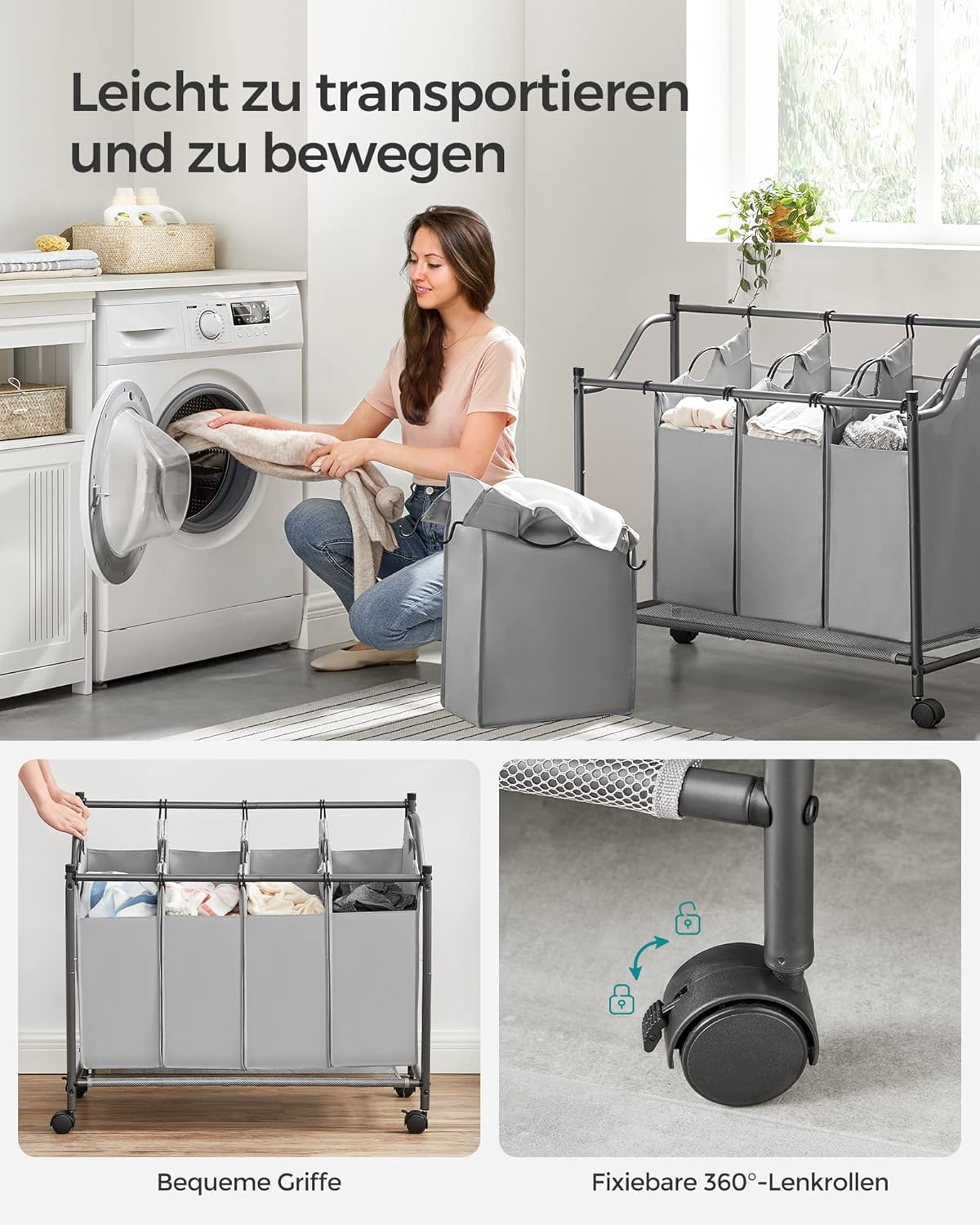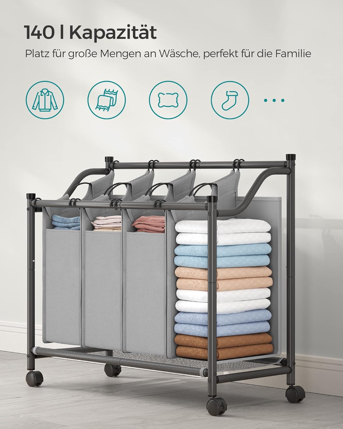 Großes 140‑Liter-Volumen für viel Wäsche, 4 abnehmbare wasserabweisende Taschen zum einfachen Sortieren, Mobil mit 4 Rollen und 2 Bremsen für sicheren Transport