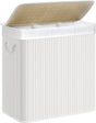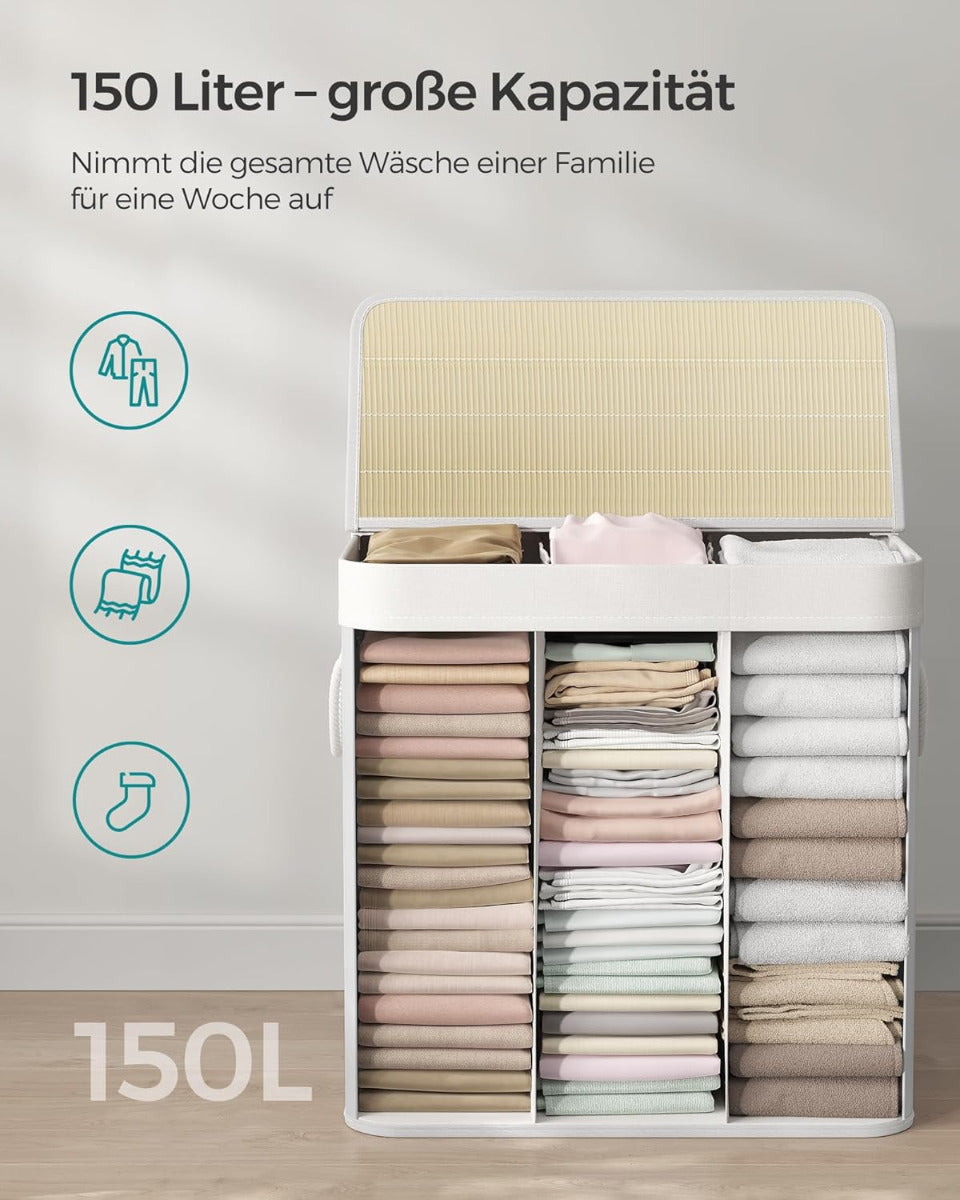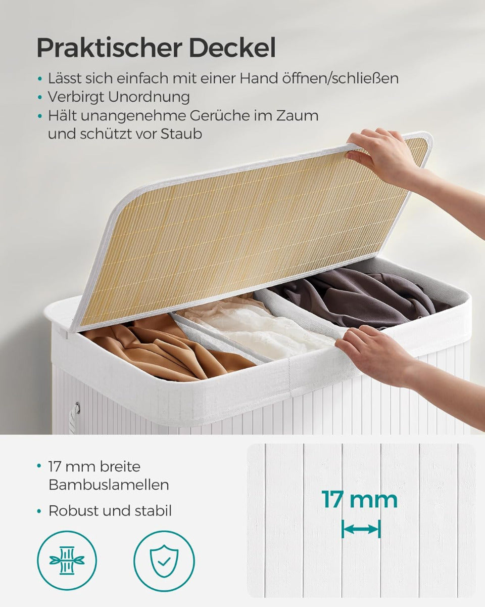 SONGMICS Wäschekorb Wäschebox aus Bambus – mit 3 Fächern, faltbar, mit Griffen und Deckel, 60 × 40 × 61 cm, weiss Der SONGMICS Wäschekorb mit 3 Fächern ist die perfekte Lösung für alle, die ihre Schmutzwäsche stilvoll und effizient organisieren möchten. Mit seinem eleganten Bambusrahmen, dem neutralen Weisston und dem natürlichen Look passt er sich harmonisch in jedes Zuhause ein – ob im Schlafzimmer, Badezimmer oder in der Waschküche. Dank der drei praktischen Fächer lässt sich die Wäsche bereits beim Sammeln vorsortieren – zum Beispiel in Weiss-, Bunt- und Feinwäsche. Der herausnehmbare Wäschesack aus Polyester-Baumwoll-Mischgewebe erleichtert das Tragen und Transportieren zur Waschmaschine. Zwei robuste Griffe und ein klappbarer Deckel sorgen für zusätzlichen Komfort im Alltag und halten die Wäsche ausserdem dezent verborgen. Die Konstruktion überzeugt durch hochwertige Materialien: Ein stabiler Metallrahmen, ein äusserer Rahmen aus Bambus und verstärkende Elemente aus Sperrholz sorgen für eine Belastbarkeit von bis zu 20 kg. Und wenn der Korb einmal nicht gebraucht wird, lässt er sich platzsparend zusammenfalten und verstauen. Mit einer Grösse von 60 × 40 × 61 cm bietet der Wäschekorb ausreichend Volumen für die gesamte Familie – praktisch, durchdacht und dabei ein echter Blickfang. Der Aufbau gelingt dank der einfachen Konstruktion und der mitgelieferten Anleitung im Handumdrehen. Produktdetails: • Farbe: Weiss• Material: Bambus, Polyester-Baumwoll-Mischgewebe, Sperrholz, Metallrahmen• Grösse: 60 x 40 x 61 cm (L x B x H)• Gewicht: 3,7 kg• Max. statische Belastbarkeit: 20 kg Lieferumfang: • 1 x Wäschekorb mit Deckel• 1 x herausnehmbarer Wäschesack• 1 x Anleitung SONGMICS Hinweise: • Bitte keine scharfen oder spitzen Gegenstände in diesem Wäschekorb aufbewahren, um Schäden oder Verletzungen zu vermeiden.• Die maximale Belastbarkeit beträgt 20 kg – bitte keine schwereren Gegenstände darin lagern.