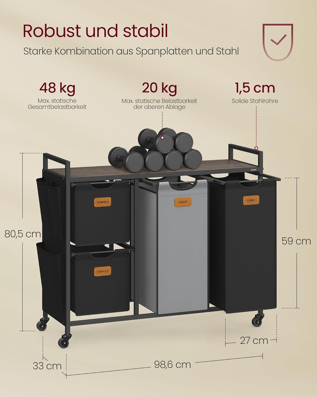 150 L Fassungsvermögen auf 4 Fächer zum einfachen Sortieren, Obere Ablage und seitliche Taschen für Waschmittel und Kleinteile, Mobil mit 4 Rollen und abnehmbaren Taschen (2 Rollen mit Bremse)