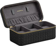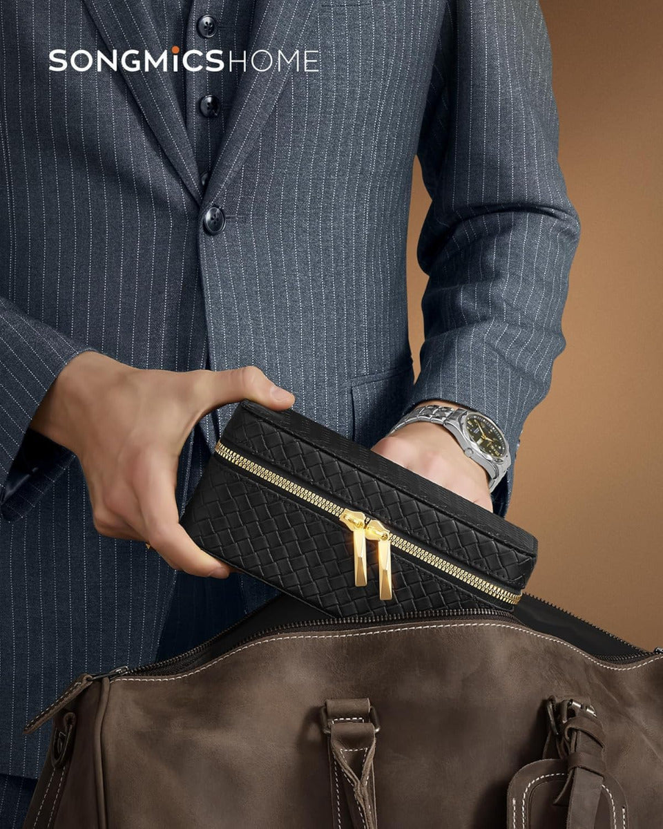 SONGMICS Uhrenbox für 3 Uhren – RONNE Kollektion, Reiseetui mit Flechtoptik, kompakt & elegant, mit Zubehörfächern, tintenschwarz & schiefergrau Die Uhrenbox aus der RONNE Kollektion von SONGMICS vereint moderne Ästhetik mit durchdachter Funktion. Ihr elegantes Äusseres in geflochtener PU-Leder-Optik, ergänzt durch vom Baguette-Schliff inspirierte Details, macht sie zu einem echten Blickfang – perfekt für unterwegs oder als stilvolles Accessoire zu Hause. Im Inneren bietet die Box 3 grosszügige Fächer für Uhren aller Grössen. Elastische Bänder und zusätzliche Taschen im Deckel sorgen für Ordnung bei Uhrenarmbändern, Ersatzgliedern oder anderen kleinen Accessoires. Das weiche Velourslederimitat schützt empfindliche Oberflächen zuverlässig vor Kratzern. Dank kompakter Masse von 10 × 20 × 9 cm und einem Gewicht von nur 390 g passt die Uhrenbox problemlos ins Gepäck oder in den Rucksack – ideal für Geschäftsreisen, Wochenendtrips oder als Geschenkidee für Uhrenliebhaber. Der umlaufende Reissverschluss sorgt für sicheren Verschluss, während das robuste Gehäuse deine Zeitmesser auch bei engem Reisegepäck optimal schützt. Produktdetails: Farbe: Bezug in Tintenschwarz, Innenfutter in Schiefergrau Material: PU (Polyurethan), Velourslederimitat, Metall Grösse: 10 x 20 x 9 cm (T x B x H) Gewicht: 390 g Lieferumfang: 1 x Uhrenbox SONGMICS HOME Hinweise: Halten Sie die Uhrenbox von Feuchtigkeit fern. Setzen Sie den Uhrenkasten nicht direktem Sonnenlicht aus, um ein Ausbleichen der Farbe zu vermeiden. Verwenden Sie keine chemischen Reinigungsmittel, um die Uhrenbox zu reinigen. Wischen Sie die Oberfläche vorsichtig mit einem feuchten Tuch ab. Halten Sie den Uhrenkoffer von scharfen Gegenständen fern, da diese die Oberfläche der Uhrenbox beschädigen können.