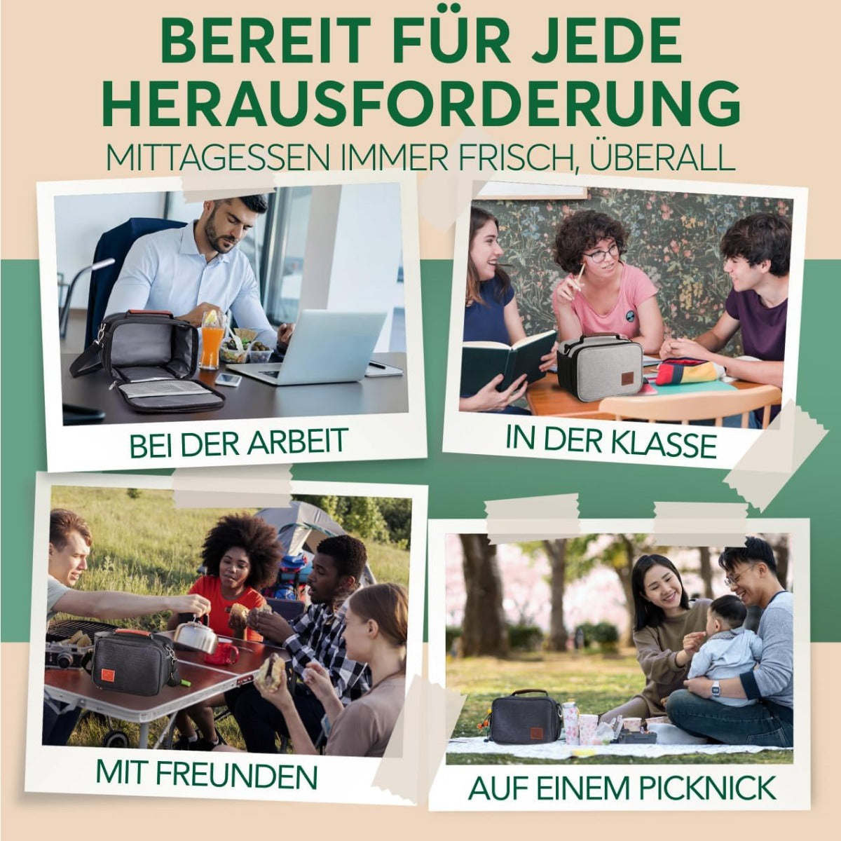 Kunden sind begeistert von der hochwertigen Isolierung, die ihre Speisen den ganzen Tag frisch hält. Das moderne und flexible Design mit ergonomischem Griff und verstellbarem Riemen macht die Lunchbag ideal für Arbeit und Reisen. Besonders geschätzt wird der geräumige Innenraum, der ausreichend Platz für eine Lunchbox bietet, sowie die wasserdichten Materialien und robusten Reißverschlüsse, die für Sicherheit sorgen. Die Vielseitigkeit der Tasche ermöglicht es, sie für verschiedene Anlässe zu nutzen.