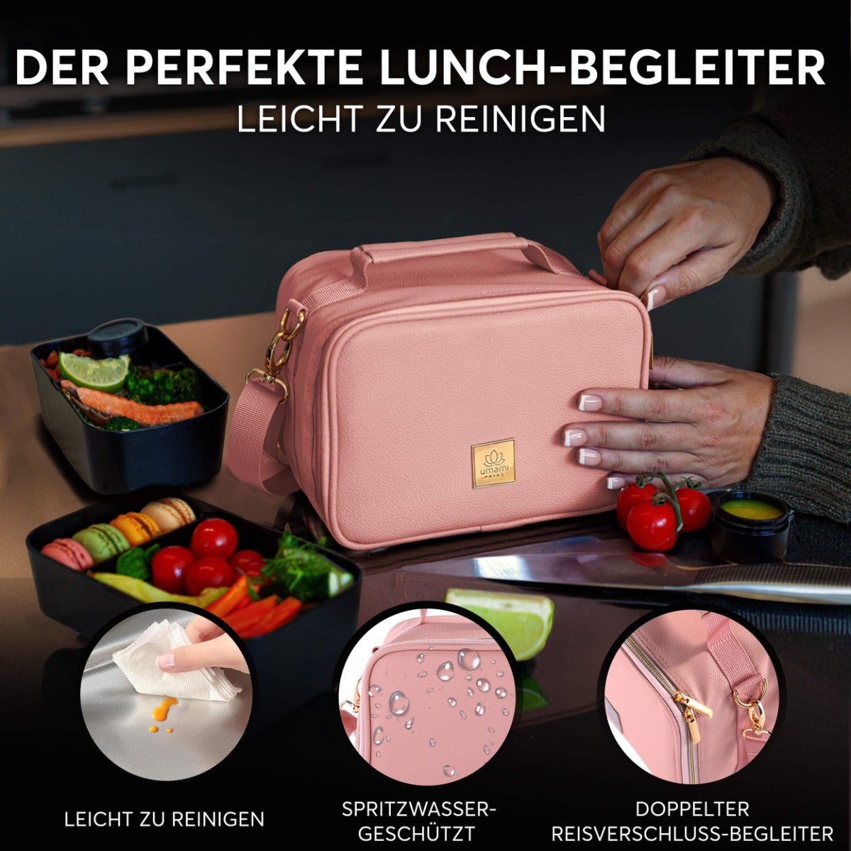 Kunden sind begeistert von der hochwertigen Isolierung der Umami Prive Lunch-Tasche, die Speisen und Getränke den ganzen Tag frisch hält. Besonders geschätzt wird das vielseitige Design, das sich ideal für Büro, Picknick oder Reisen eignet. Die praktische, spritzwassergeschützte Tasche ist leicht zu reinigen und bietet mit ihrem modernen, veganen Leder nicht nur Stil, sondern auch eine umweltfreundliche Lösung für den Mahlzeitentransport.