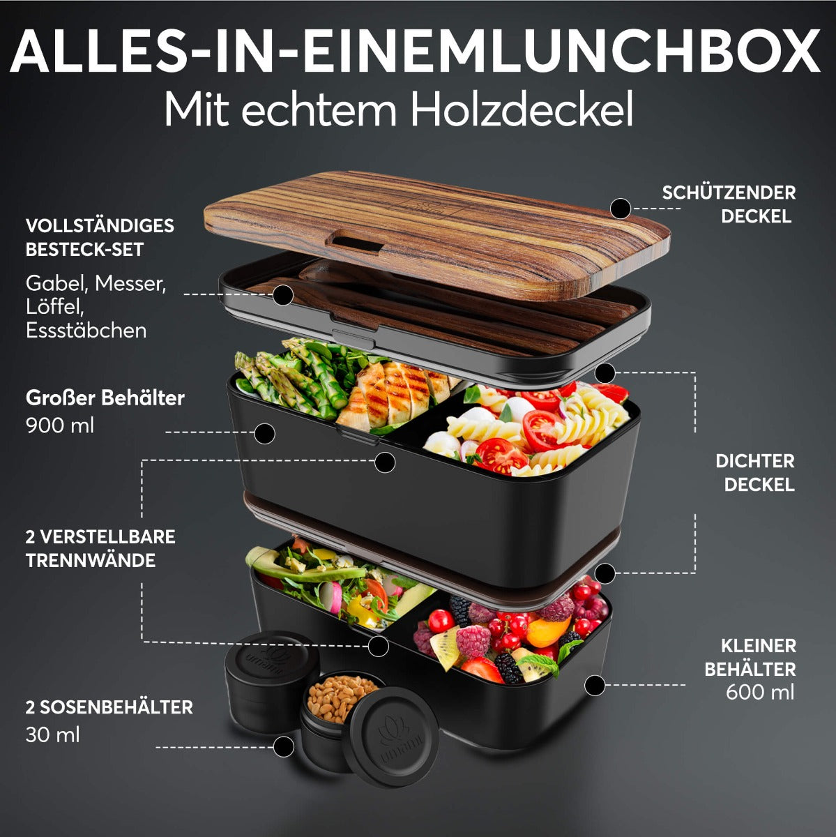 Hochwertige Materialien: Gefertigt aus robustem, BPA-freiem Kunststoff, garantiert die Lunchbox Langlebigkeit und Nachhaltigkeit. Der Deckel ist aus hochwertigem Holz hergestellt und verleiht der Lunchbox eine natürliche Eleganz. Auslaufsicheres Design: Mit einem zuverlässigen Dichtungsmechanismus ausgestattet, hält die Box Ihr Essen sicher und verhindert das Auslaufen von Flüssigkeiten. Anpassbare Fächer: Dank der zwei Ebenen und der verstellbaren Trennwände lässt sich die Lunchbox perfekt auf Ihre Essensbedürfnisse abstimmen. Ob eine grosse Mahlzeit oder kleine Snacks für zwischendurch, die Gestaltungsmöglichkeiten sind endlos. Die schlaue Konstruktion ermöglicht es, den kleineren Behälter im grösseren zu verstauen, was nicht nur Platz spart, sondern auch den Transport erleichtert. Mikrowellen- und spülmaschinengeeignet: Die Bento Box ist für die Verwendung in der Mikrowelle (ohne Deckel) geeignet und kann zur einfachen Reinigung in die Spülmaschine gegeben werden. Inklusive Saucenbehälter: Für Dressings und Saucen sind kleine Behälter enthalten, die ein Auslaufen verhindern und die Geschmacksvielfalt Ihrer Mahlzeiten erhöhen. Tragbar und stilvoll: Die Kombination aus dem langlebigen Kunststoffkörper und dem edlen Holzdeckel macht sie zu einem Accessoire, das in jeder Situation Eleganz ausstrahlt. Grosszügiges Fassungsvermögen: Mit ihrem grosszügigen Volumen bietet die Box genug Platz für eine umfangreiche Mahlzeit, Snacks und mehr. Wenn sie nicht gebraucht wird, lässt sich die Box kompakt verstauen, was sie zum idealen Begleiter für jeden macht, der Wert auf Effizienz und Ordnung legt.