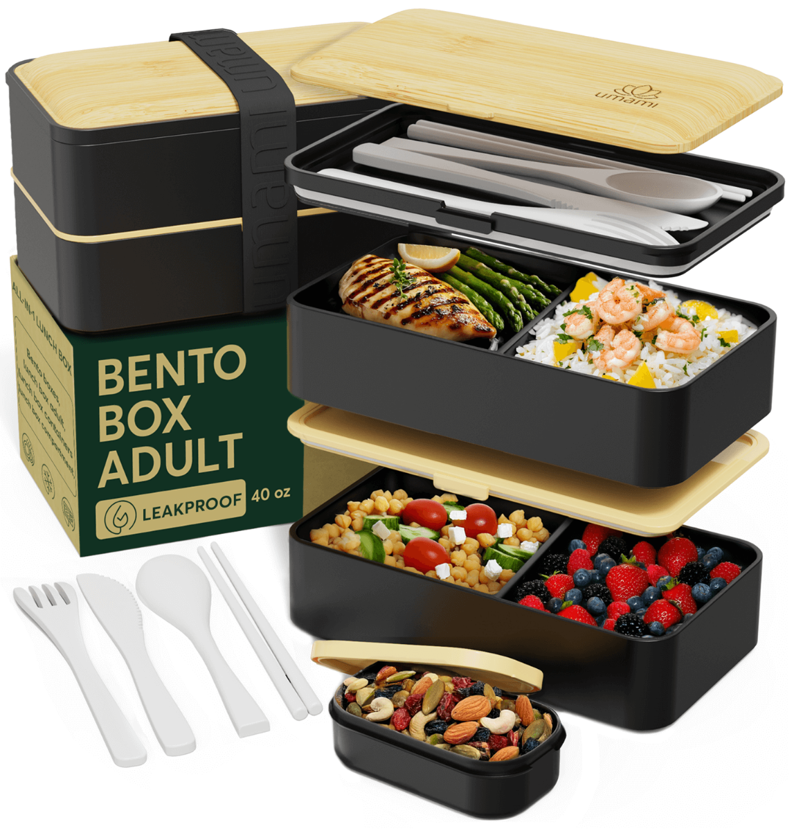 Hochwertige Materialien: Hergestellt aus robustem, BPA-freiem Kunststoff mit einem Deckel aus elegantem Bambus, vereint diese Box Nachhaltigkeit mit Langlebigkeit. Auslaufsicheres Design: Mit einem zuverlässigen Dichtungsmechanismus ausgestattet, hält die Box Ihr Essen sicher und verhindert das Auslaufen von Flüssigkeiten. Praktische Fächer: Die Box verfügt über mehrere Fächer, die eine einfache Trennung verschiedener Speisen ermöglichen, um Geschmack und Frische zu bewahren. Mikrowellen- und spülmaschinengeeignet: Die Bento Box ist für die Verwendung in der Mikrowelle (ohne Deckel) geeignet und kann zur einfachen Reinigung in die Spülmaschine gegeben werden. Inklusive Saucenbehälter: Für Dressings und Saucen sind kleine Behälter enthalten, die ein Auslaufen verhindern und die Geschmacksvielfalt Ihrer Mahlzeiten erhöhen. Tragbar und stilvoll: Das elegante Schwarz des Behälters kombiniert mit dem natürlichen Bambusdeckel macht die Bento Box zu einem modischen Accessoire. Grosszügiges Fassungsvermögen: Mit ihrem großzügigen Volumen bietet die Box genug Platz für eine vollständige Mahlzeit, Snacks und mehr.