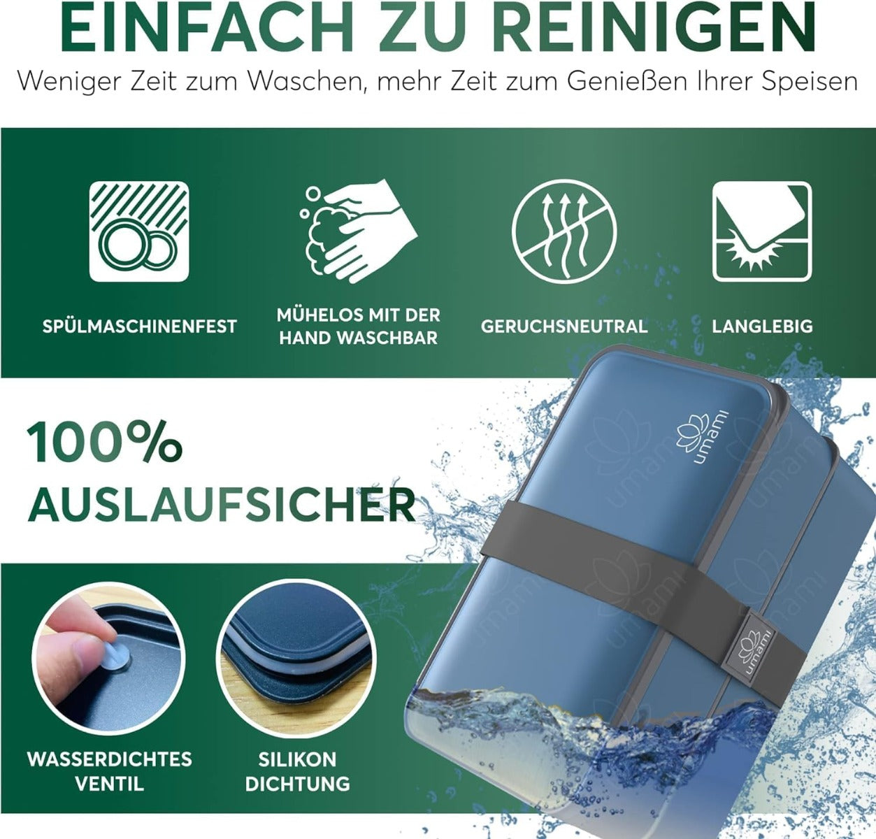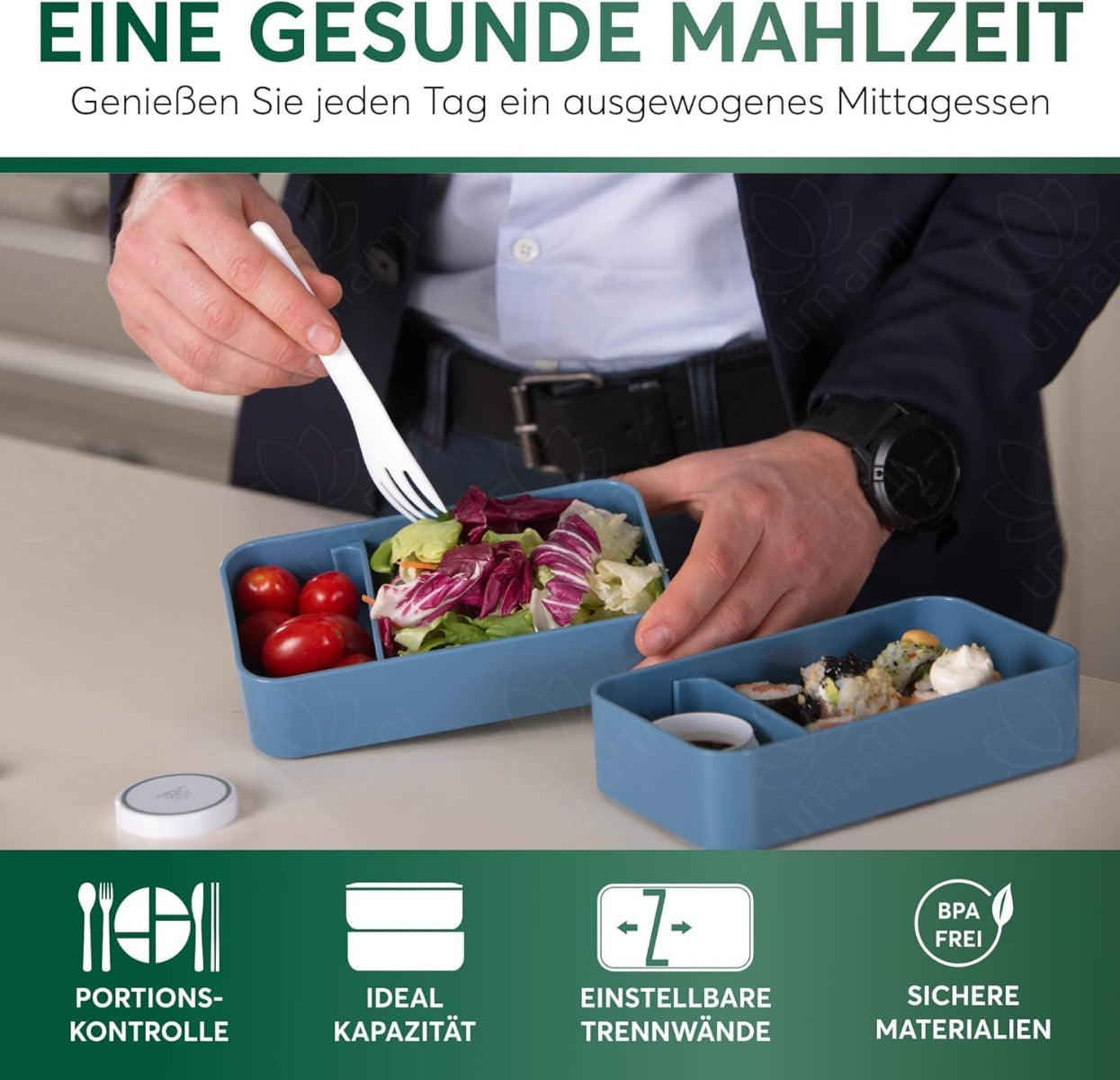 Hochwertige, BPA-freie Materialien, Auslaufsicheres Design für sicheres Transportieren, Praktische Fächer für einfache Essenstrennung