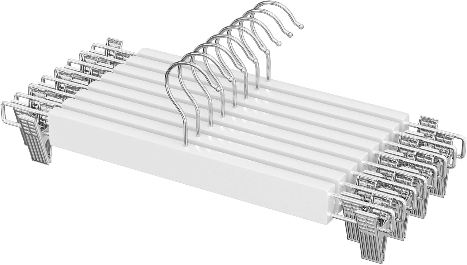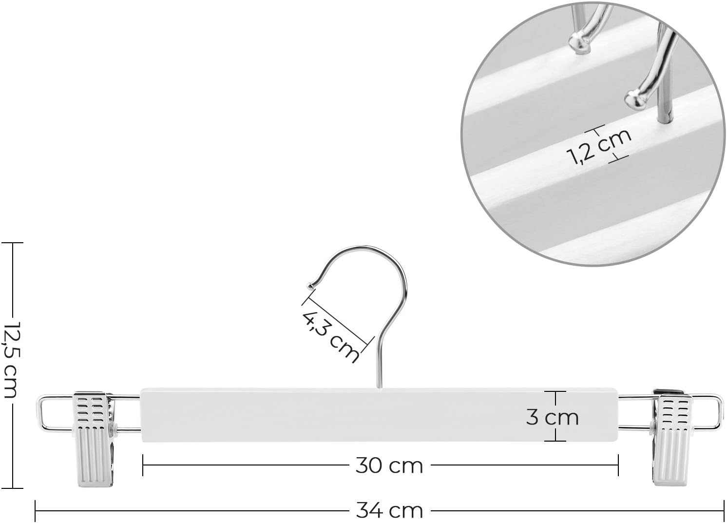 SONGMICS 8er Set Hosen- & Rockbügel aus Holz – weiss lackiert, mit verstellbaren rutschfesten Klammern, 360° drehbarer Haken, für Hosen, Shorts & Röcke Mit den SONGMICS Hosen- und Rockbügeln aus Holz bringst du Ordnung und Stil in deinen Kleiderschrank. Das Set enthält 8 formstabile Holzbügel mit weisser Lackierung, die dank ihrer klaren Optik in jede Garderobe passen. Ausgestattet mit zwei verstellbaren Klammern lassen sich verschiedenste Kleidungsstücke flexibel und sicher befestigen – von Röcken über Shorts bis hin zu klassischen Hosen. Die Metallklammern sind mit einer rutschfesten Gummierung versehen, damit deine Kleidung nicht verrutscht oder Druckstellen bekommt. Besonders praktisch: Die Klammern lassen sich entlang der Querstange individuell verschieben und so perfekt an Breite und Schnitt des Kleidungsstücks anpassen. Der Haken aus verchromtem Metall ist um 360° drehbar – ideal für flexibles Aufhängen in jeder Richtung. Die Bügel bestehen aus robustem Schima-Holz und bieten eine langlebige, stabile Lösung für den Alltag – ob im Schlafzimmer, Gästezimmer oder professionellen Einsatz. SONGMICS kombiniert hier Funktionalität mit hochwertigem Material und einem dezenten, modernen Look. Eine clevere Wahl für alle, die Wert auf Übersicht, Qualität und schönes Design legen.