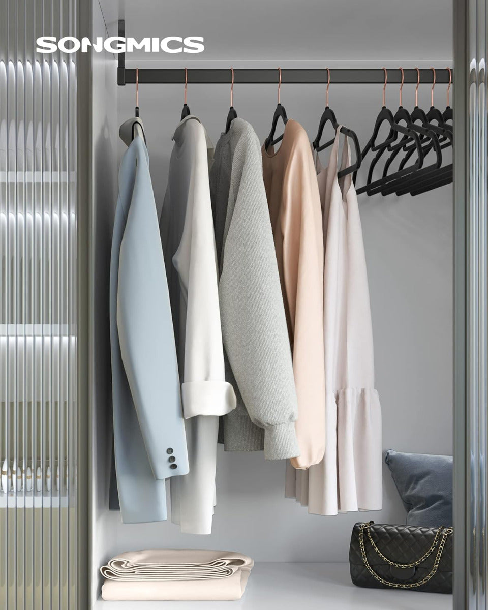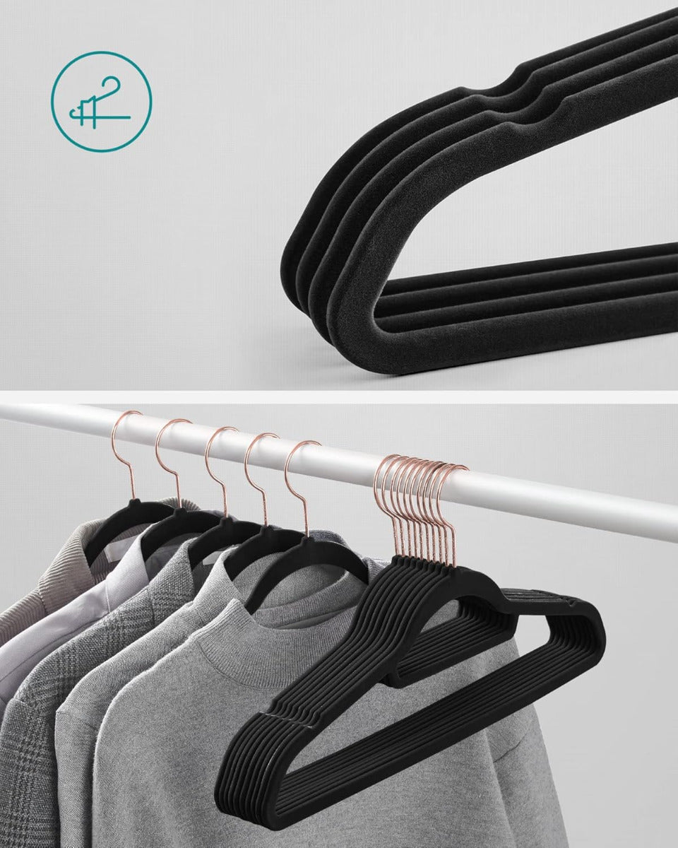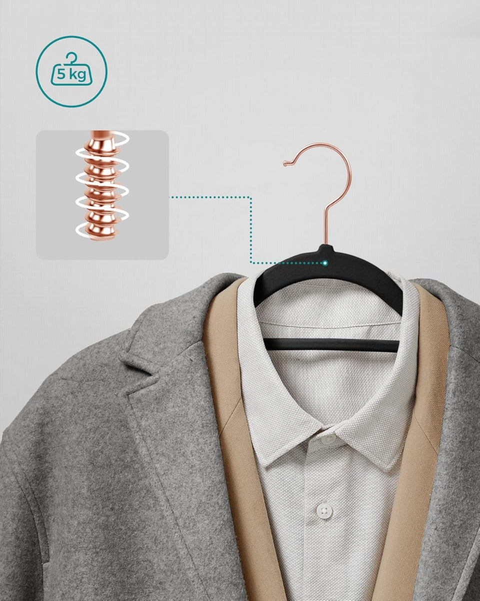 SONGMICS 30er Set Samt-Kleiderbügel – platzsparend, 360° drehbarer Haken, U-förmige Öffnung, 41,5 cm breit – schwarz, rutschfest & formschonend für Alltag & Business Die SONGMICS Samt-Kleiderbügel im praktischen Set vereinen elegantes Design mit cleverer Funktionalität. Ihre samtige Oberfläche sorgt für rutschfesten Halt – selbst bei feinen Stoffen – und schützt gleichzeitig die Form deiner Kleidung. Dank der geschwungenen Schulterpartien entstehen keine Druckstellen, während die U-förmige Aussparung das Aufhängen von Kleidungsstücken mit engem Kragen erleichtert. Mit nur 0,5 cm Dicke sind die Bügel besonders platzsparend und helfen dir, den Stauraum im Schrank optimal zu nutzen. Jeder Bügel ist robust genug, um bis zu 5 kg zu tragen – ideal auch für schwerere Kleidungsstücke wie Jacken oder Pullover. Der um 360° drehbare Haken aus Metall sorgt für zusätzliche Flexibilität beim Aufhängen, unabhängig davon, wie deine Garderobe organisiert ist. Ein integrierter Mittelsteg bietet zudem Platz für Accessoires wie Schals oder Krawatten. Das Set wird sicher verpackt geliefert und ist sowohl im privaten als auch im gewerblichen Bereich vielseitig einsetzbar – etwa in Hotels, Boutiquen oder Ankleidezimmern. Die neutrale Farbe passt sich jeder Einrichtung an und verleiht deinem Kleiderschrank ein aufgeräumtes, einheitliches Erscheinungsbild. Die SONGMICS Samt-Kleiderbügel sind eine zuverlässige Lösung für alle, die Wert auf Ordnung, Langlebigkeit und dezente Eleganz legen.