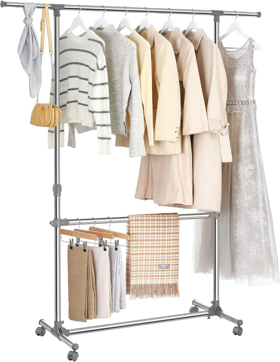Kunden sind begeistert von der variablen Höhen- und Längenverstellbarkeit, der stabilen Edelstahlkonstruktion und den leichtlaufenden Rollen. Besonders geschätzt werden die zwei Ebenen für platzsparende Aufbewahrung, die hohe Tragkraft (bis 25 kg pro Stange), das rostfreie Material und der schnelle, kinderleichte Aufbau sowie das zeitlose, unauffällige Design.