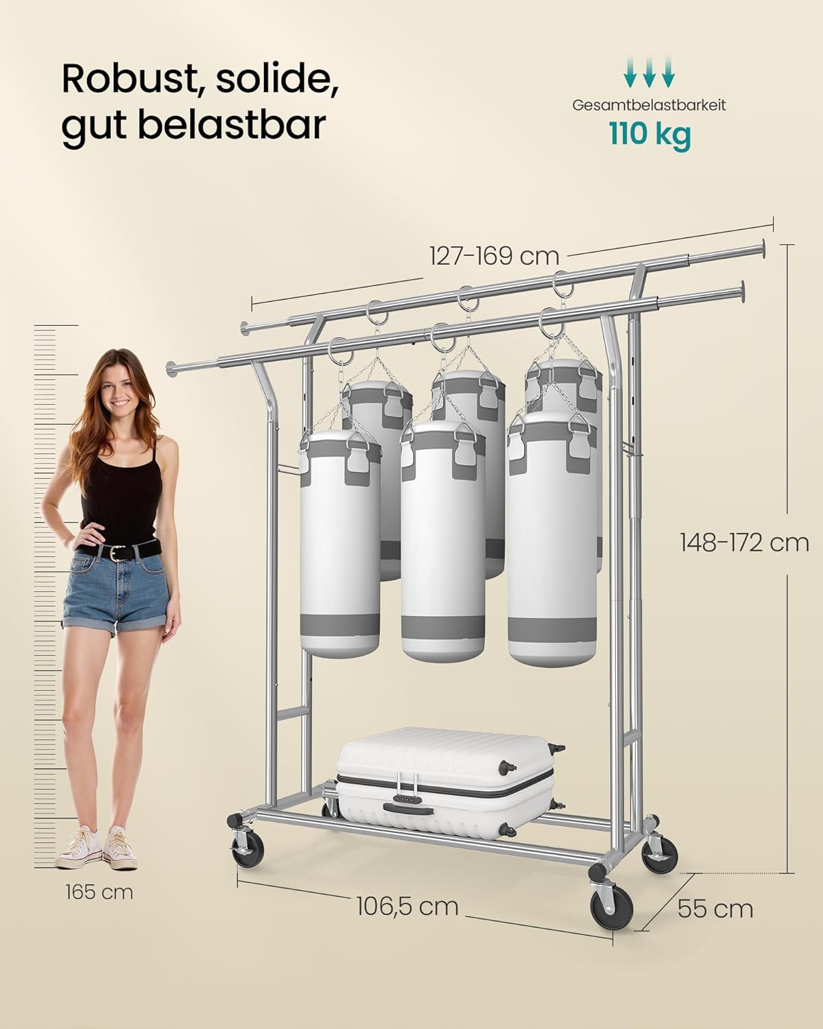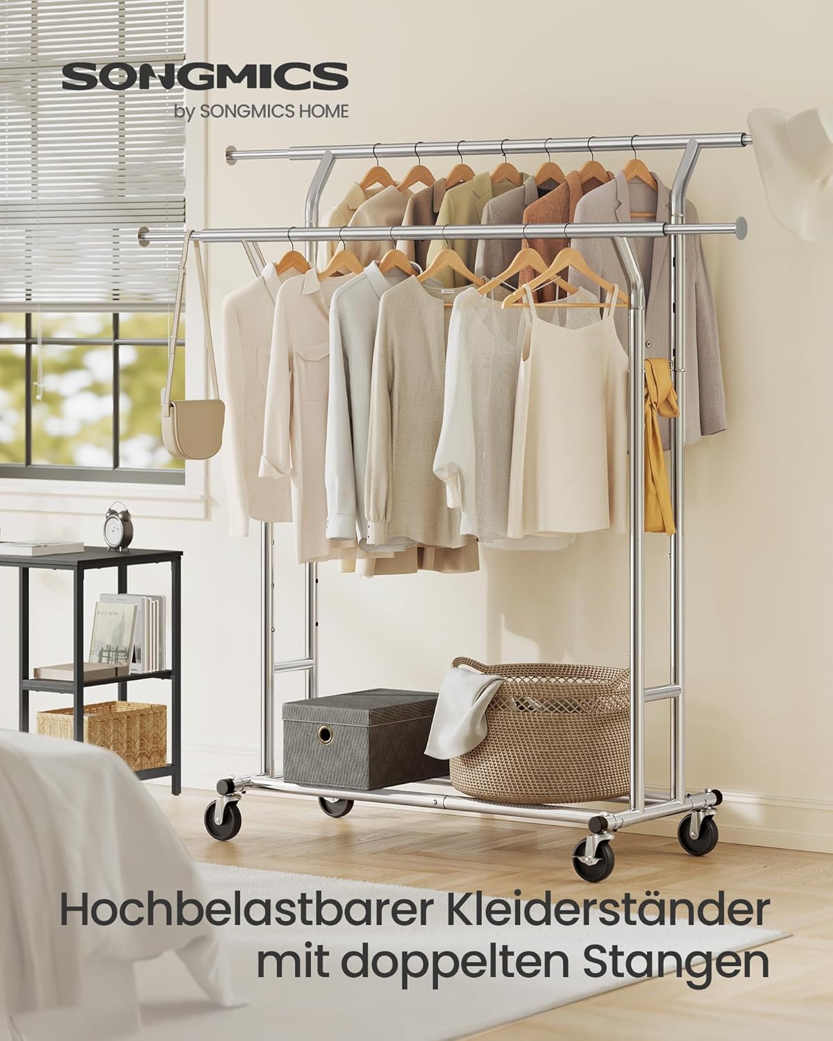 Der SONGMICS Schwerlast-Kleiderständer HSR12S aus verchromtem Stahl bietet dank ausziehbarer Kleiderstange (129–169 cm), höhenverstellbarer Konstruktion und 110-kg-Tragkraft grosszügigen, flexibel anpassbaren Platz für Kleidung im Zuhause oder Gewerbe. Mit leichtgängigen 12-cm-Industrierollen, zwei Bremsen und werkzeugloser Klickmontage ist er stabil, mobil und schnell einsatzbereit.