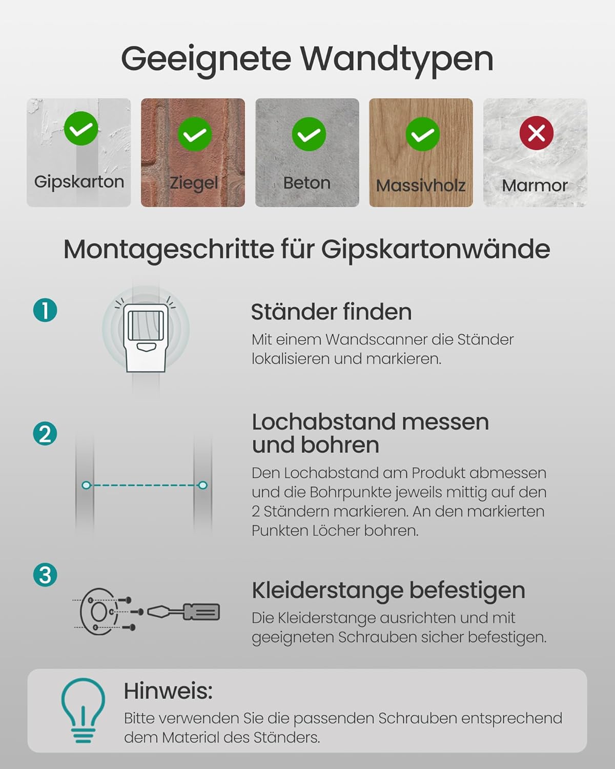 Trägt bis zu 60 kg pro Stange bei massiver Wandmontage, 30 cm Wandabstand für störungsfreies Aufhängen von Kleidung, Einfache Montage mit beiliegendem Befestigungsmaterial