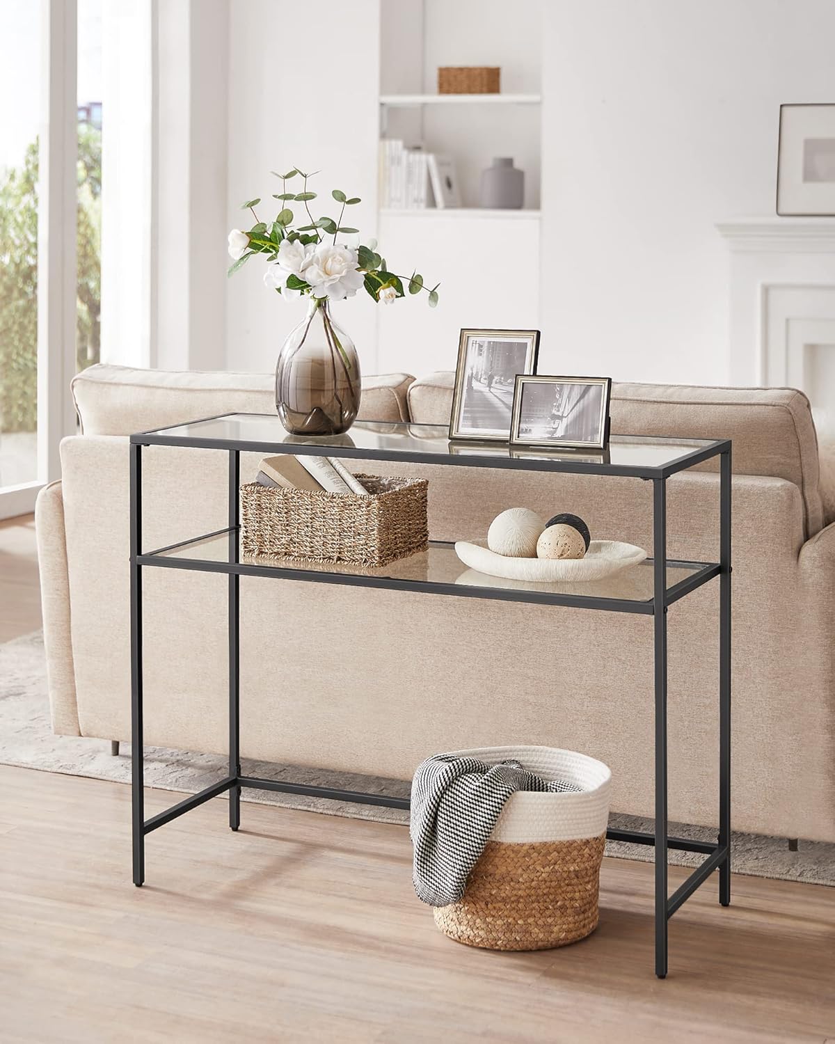 Der VASAGLE Konsolentisch LGT025B01 vereint zeitlosen Minimalismus mit robuster Funktionalität und ist die perfekte Lösung für alle, die ihrem Zuhause eine moderne, klare Note verleihen möchten. Sein mattes schwarzes Metallgestell und die elegante Hartglas-Tischplatte schaffen ein zurückhaltend-elegantes Erscheinungsbild, das sich nahtlos in Wohnzimmer, Flur, Eingangsbereich oder sogar die Küche einfügt. Mit den kompakten Massen von 100 x 35 x 80 cm bietet diese Konsole genügend Ablagefläche, ohne dominant zu wirken, und passt ideal hinter das Sofa, an die Wand im Flur oder als stilvolle Anrichte neben Ihrer Küchenzeile. Die 5 mm dicke Sicherheitsglasplatte ruht sicher auf dem stabilen Stahlrahmen und trägt pro Ebene bis zu 20 kg, sodass Bücher, dekorative Objekte, Pflanzen oder elektronische Geräte zuverlässig Platz finden. Trotz seines schlanken Designs überzeugt der Tisch mit hoher Standfestigkeit; verstellbare Füsse gleichen kleinere Bodenunebenheiten aus und sorgen für sicheren Stand auf Parkett, Fliesen oder Teppich. Der Aufbau ist bewusst nutzerfreundlich gestaltet: gekennzeichnete Einzelteile, eine leicht verständliche Anleitung und das vollständige Zubehör im Lieferumfang ermöglichen eine schnelle Montage, sodass Sie im Handumdrehen den neuen Blickfang in Ihren vier Wänden platzieren können. Mit einem Gesamtgewicht von nur 13,8 kg ist der Konsolentisch leicht zu positionieren, dennoch stabil konstruiert und langlebig verarbeitet – eine clevere Kombination aus Stahl und Glas, die Pflegeleichtigkeit mit modernem Design verbindet. Im Paket enthalten sind eine Konsole, ein Zubehörset und die Montageanleitung, sodass Sie direkt loslegen können. Ob als praktische Abstellfläche für Schlüssel und Post im Eingangsbereich, als elegante Präsentationsfläche für Deko im Wohnraum oder als zusätzliche Ablage in der Küche: der VASAGLE Konsolentisch LGT025B01 ist ein vielseitiges, stilvolles Möbelstück, das Ihrem Zuhause Struktur, Eleganz und Funktionalität verleiht.
