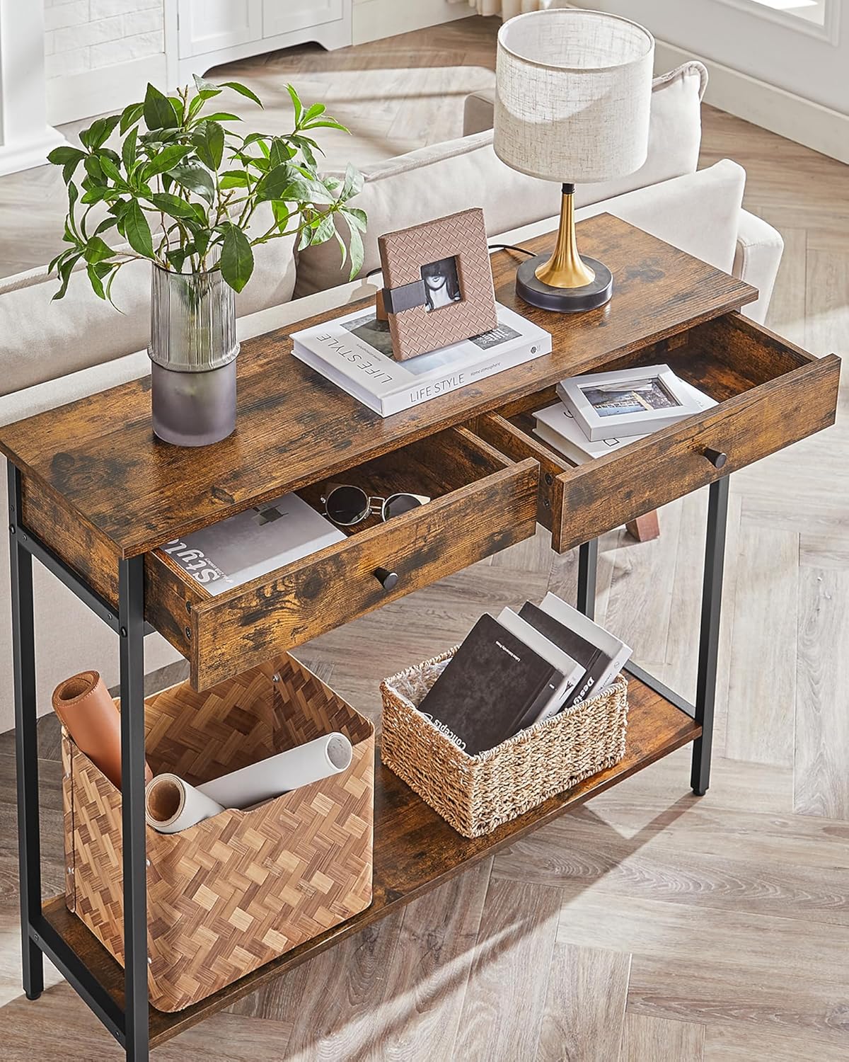 Platzsparende Ablage für Deko und Schlüssel, Zwei Schubladen für versteckten Stauraum, Robustes Stahlgestell mit verstellbaren Füßen für stabile Aufstellung