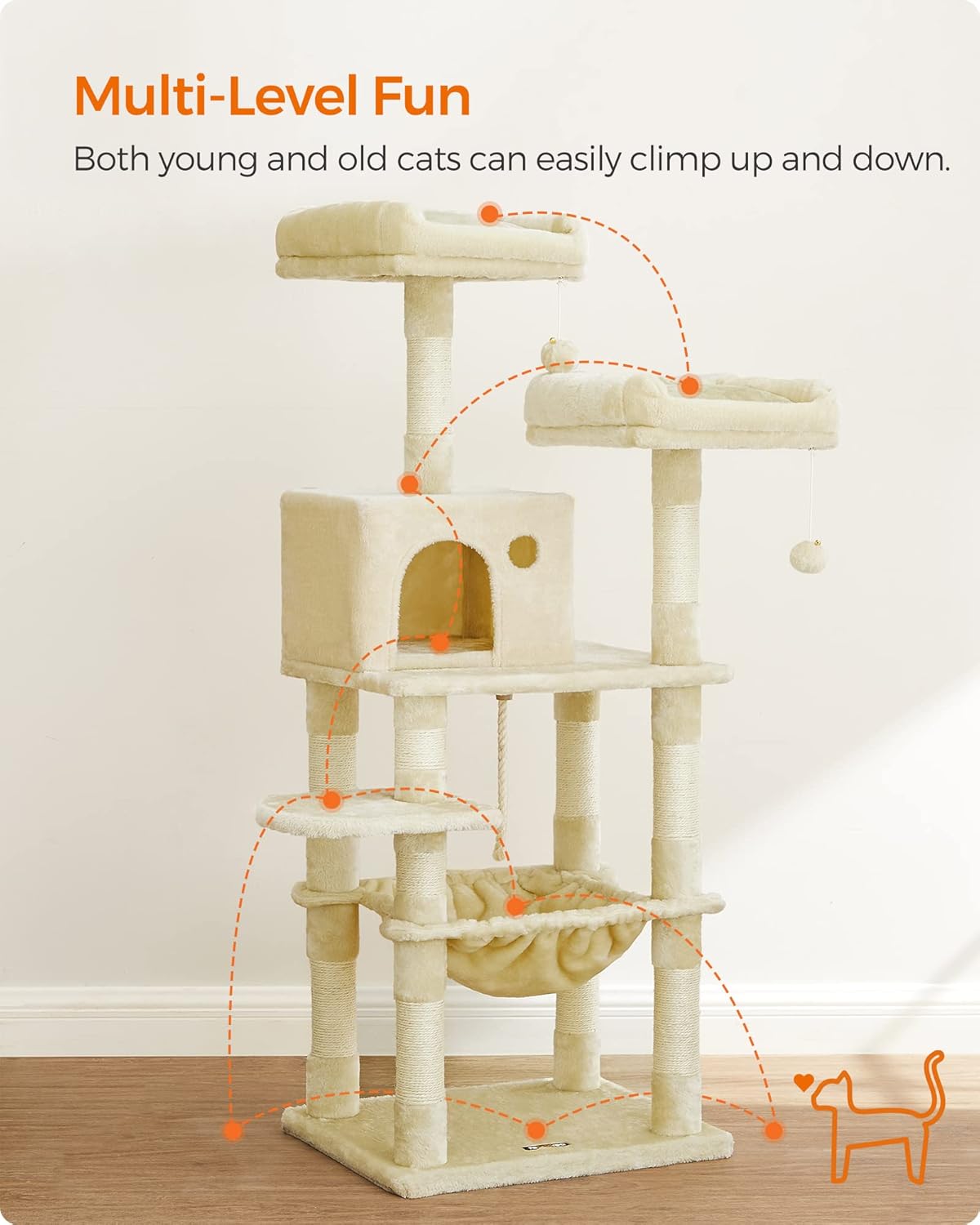 143 cm mehrstufiger Kletter- und Rückzugsort, 11 Sisal-Kratzsäulen schützen Möbel, Hängematte, Höhle und Spielbälle für Kuscheln und Spiel