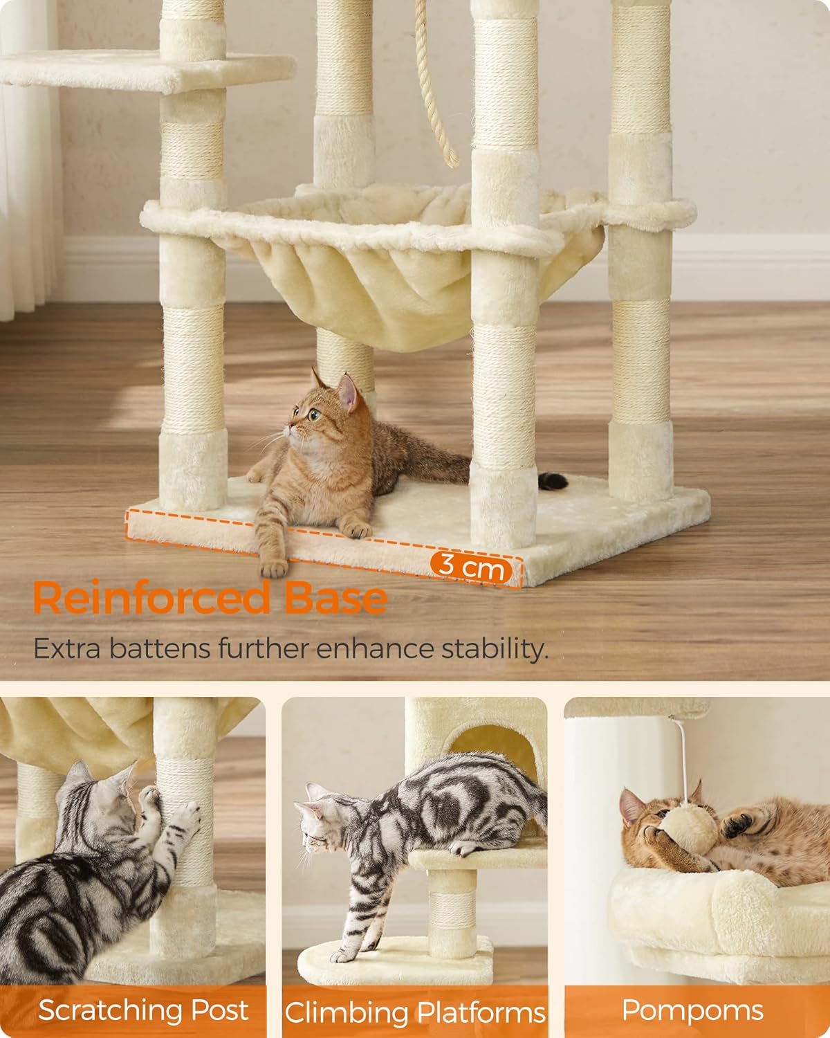 Kunden sind begeistert vom Feandrea Kratzbaum: die 143 cm Höhe, die bequeme Hängematte und die kuschelige Höhle bieten perfekten Komfort. Besonders geschätzt werden die 11 stabilen Sisal-Kratzsäulen, die gepolsterten Plattformränder, das mehrstufige Kletterdesign für mehrere Katzen, die hängenden Spielbälle mit Glöckchen sowie die einfache Montage und leichte Reinigung.