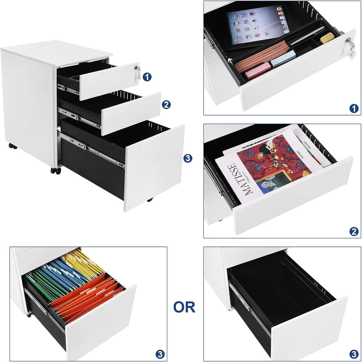 Stabiler Stahlbau mit bis zu 20 kg Traglast, drei vollausziehbare Schubladen für A4/Letter/Legal, integriertes Schloss und vormontiert auf fünf Rollen