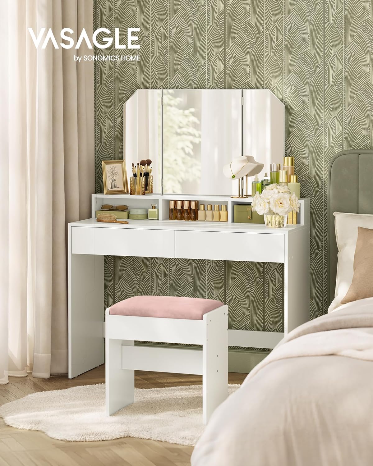 Der VASAGLE Schminktisch RDT115W01 in elegantem Wolkenweiss bietet dank 3-teiligem Klappspiegel, zwei Schubladen und offenen Ablagen einen übersichtlichen, stilvollen Platz für deine Beauty-Routine – kompakt, modern und perfekt organisiert.
