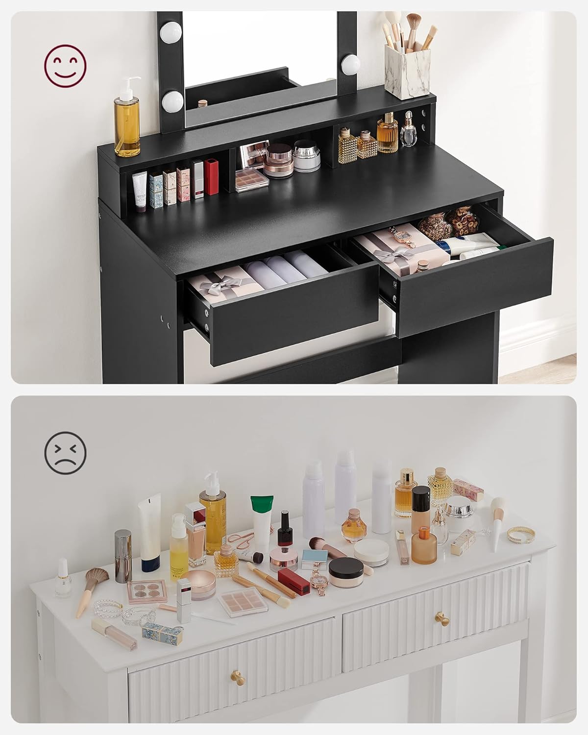 Stufenlos dimmbare LED-Beleuchtung für präzises Make-up, Großer Spiegel für optimale Sicht, Viel Stauraum mit offenen Fächern und geräumigen Schubladen für Stylinggeräte