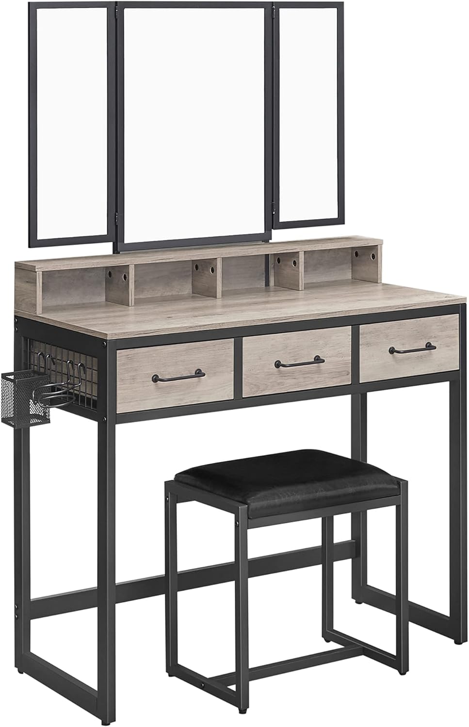 Der VASAGLE Schminktisch in elegantem Greige-Schwarz vereint modernes Design mit durchdachter Funktionalität und schafft so eine perfekte Schönheitsstation für Ihr Schlafzimmer oder Ankleidezimmer. Mit Aussenmassen von 90 x 40 x 141 cm (L x B x H) bietet die kompakte, aber grosszügig bemessene Arbeitsfläche ausreichend Platz für Spiegelbild und Make-up-Accessoires, während das robuste Gesamtsystem aus hochwertiger Spanplatte (chipboard) und stabilem Stahlrahmen langlebige Stabilität gewährleistet; das Gesamtgewicht beträgt 25,7 kg. Drei geräumige Schubladen schaffen Ordnung und befreien die Arbeitsplatte von Lidschattenpaletten, Lippenstiften und Linern, ergänzt durch vier praktische Fächer unter dem dreigeteilten Spiegel, die ideale Aufbewahrungsorte für Hautpflegeprodukte, Pinsel und Haarstylingwerkzeuge sind. Besonderer Komfort: ein Bürstenbehälter (8 x 8 x 10 cm) für Make-up-Pinsel und ein seitlicher Haartrocknerhalter, damit Ihr Föhn griffbereit und sicher verstaut ist. Der dreifach gefaltete Spiegel ermöglicht Sie-Links-Rechts-Überprüfen-Blicke aus jedem Winkel, sodass Sie Haare und Make-up jederzeit perfekt kontrollieren und einen makellosen Look erzielen können. Der im Set enthaltene gepolsterte Hocker (42 x 28,6 x 42,5 cm, L x B x H) sorgt für bequemen Sitzkomfort beim Schminken; er ist auf eine maximale statische Belastbarkeit von 150 kg geprüft. Das Materialmix aus Glas, Kunstleder (faux leather) und Schaumstoff am Hocker rundet die hochwertige Optik und Haptik ab. Die Montage wird durch eine klare Schritt-für-Schritt-Anleitung erleichtert, und im Lieferumfang sind neben dem Schminktisch und dem Hocker auch ein Zubehörpaket sowie das Montagehandbuch enthalten. Für Ihre Sicherheit liegt ein Kippschutz-Set bei, mit dem der Tisch an der Wand befestigt werden sollte. Ob Sie ein aufgeräumtes Beauty-Setup suchen, zusätzlichen Stauraum benötigen oder einfach einen stilvollen Frisiertisch im modernen Stil wünschen: Dieser VASAGLE Schminktisch kombiniert durchdachte Details, solide Verarbeitung und elegantes Design zu einer attraktiven Komplettlösung für Ihre tägliche Beauty-Routine.