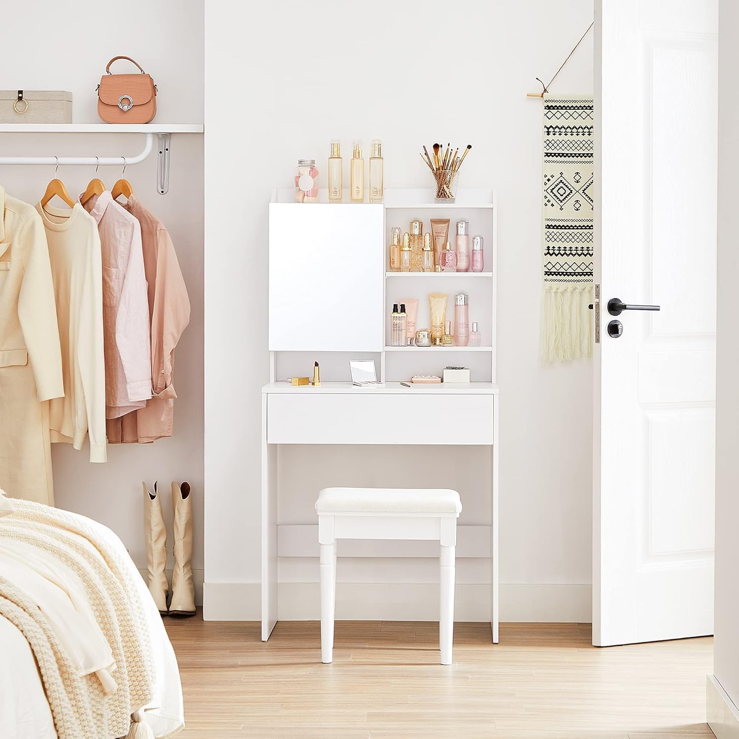 Entdecken Sie den SONGMICS Schminktisch – die perfekte Kombination aus Stil und Funktionalität für Ihr Schlafzimmer oder Ankleidezimmer. Mit seinem minimalistischen Design, das durch klare Linien und eine elegante wolkenweisse Oberfläche besticht, fügt sich dieser Frisiertisch nahtlos in jede Einrichtung ein und verleiht Ihrem Raum eine moderne Note. Der SONGMICS Kosmetiktisch bietet reichlich Stauraum für all Ihre Beautyartikel. Mit einer praktischen Ablage oben, vier durch zwei höhenverstellbaren Ablagen, zwei kleinen offenen Fächern und einer geräumigen Schublade haben Sie genügend Platz, um alles ordentlich zu verstauen. So finden Sie immer schnell, was Sie brauchen. Besonders praktisch sind die 3-stufig höhenverstellbaren Ablagen, die es Ihnen ermöglichen, Ihre Produkte nach Grösse zu sortieren und optimal zu präsentieren. Egal, ob Lippenstifte, Parfums oder Haaraccessoires – alles hat seinen eigenen Platz. Hergestellt aus hochwertigen Spanplatten, ist dieser Schminktisch nicht nur stabil und langlebig, sondern auch pflegeleicht. Die glatte Oberfläche lässt sich mühelos mit einem Tuch reinigen, sodass Ihr Beauty-Bereich immer ordentlich und einladend bleibt. Der Aufbau des SONGMICS Frisiertisches gestaltet sich dank der klaren, bebilderten Anleitung und der gekennzeichneten Teile kinderleicht. In kürzester Zeit verwandeln Sie Ihr Zimmer in eine stilvolle Beauty-Oase, die zum Verweilen einlädt. Gönnen Sie sich diesen eleganten Schminktisch und geniessen Sie Ihre tägliche Schminkroutine in einem ansprechenden Ambiente!