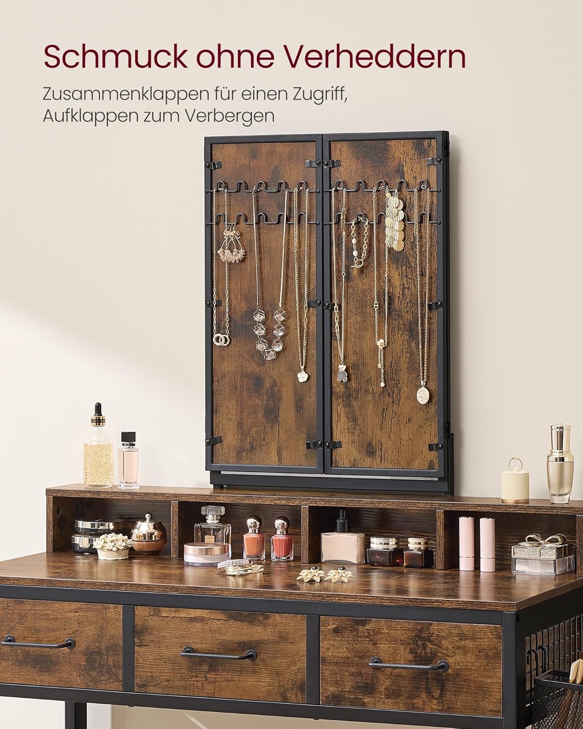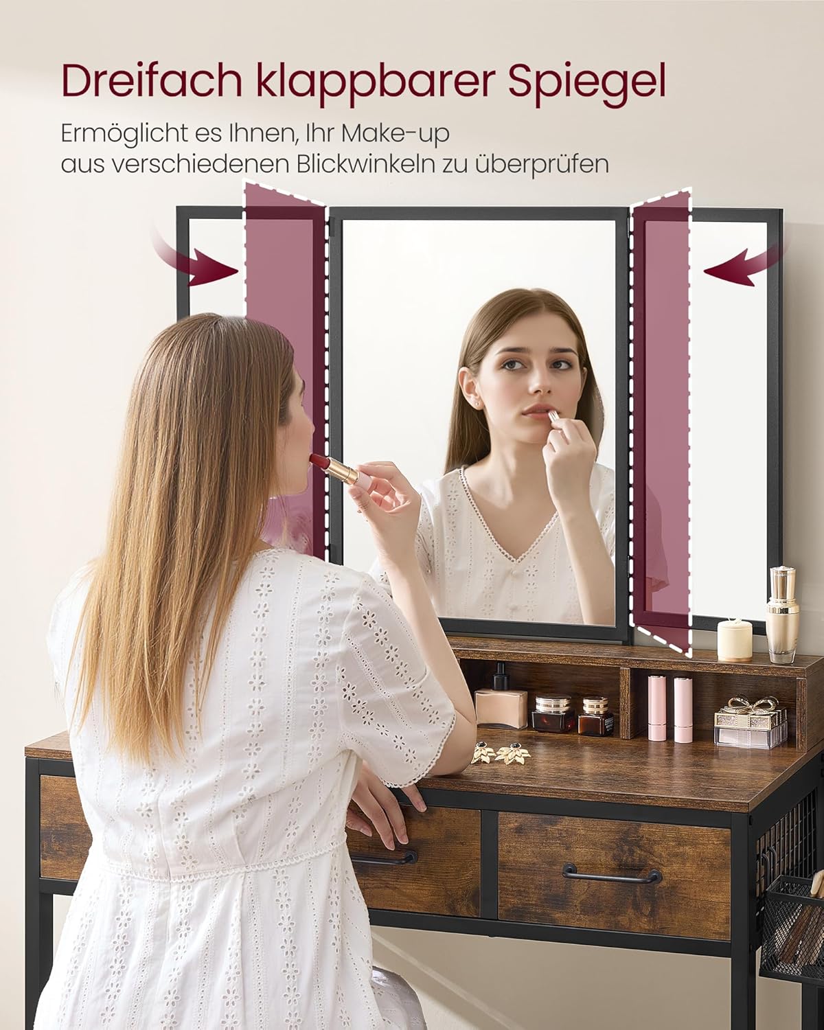 Der rustikal-braune VASAGLE Schminktisch im Industrial-Stil bietet drei Schubladen, vier Zusatzfächer, einen dreifach klappbaren Spiegel und einen gepolsterten Hocker – eine stabile, stilvolle Lösung für ein perfekt organisiertes Beauty-Setup.