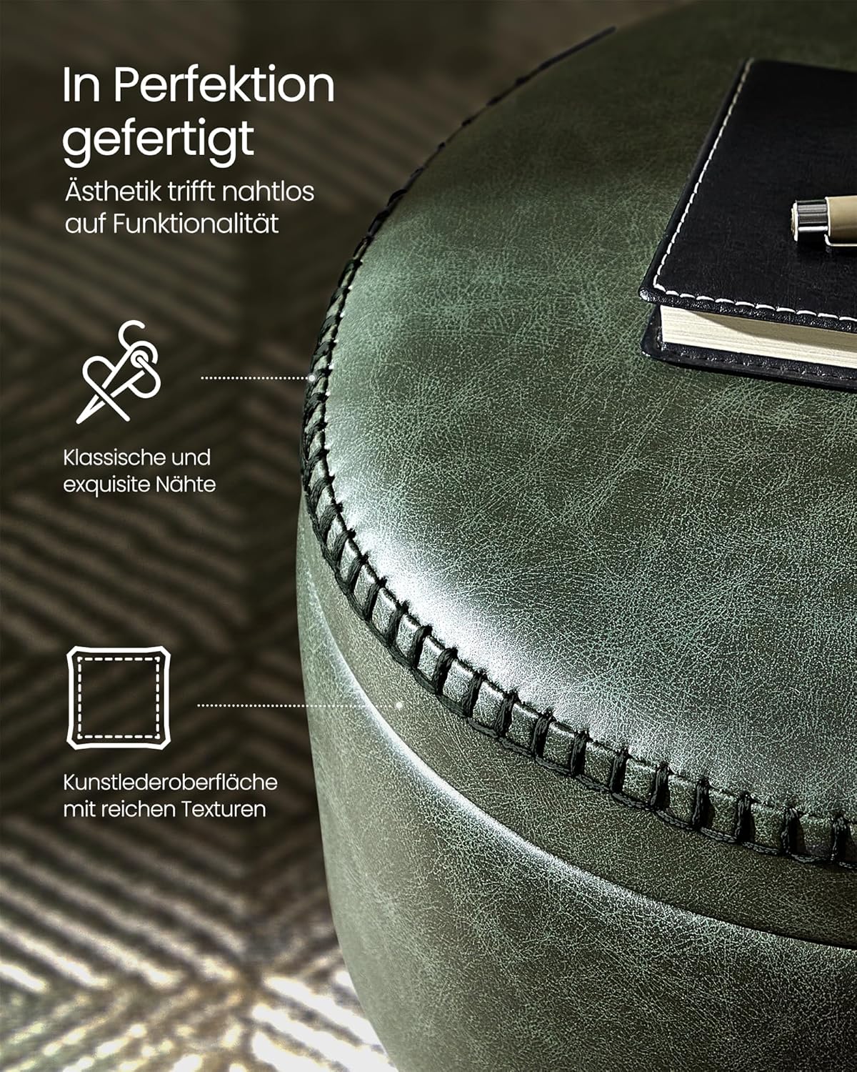 Entdecken Sie den SONGMICS EKHO Sitzhocker – eine stilvolle Ergänzung für Ihr Zuhause, die Funktionalität und Design perfekt vereint. Ausgezeichnet mit dem Bronze A' Design Award 2024, besticht dieser Hocker durch sein elegantes Kunstleder und die raffinierten Nähte, die eine Hommage an die Handwerkskunst darstellen. In einem modernen, runden Mid-Century-Modern-Stil gehalten, wird er zum Blickfang in jedem Raum. Der SONGMICS EKHO Sitzhocker ist nicht nur ein optisches Highlight, sondern auch äusserst vielseitig. Ob als schicker Schminktischhocker, gemütliche Fussstütze oder praktischer Beistelltisch – dank des umklappbaren Deckels passt er sich Ihren Bedürfnissen an. Das integrierte Fach mit einer Kapazität von 9,4 Litern bietet ausreichend Platz für Ihre Kleinigkeiten und sorgt für Ordnung. Robust und langlebig, steht dieser Hocker auf vier stabilen Stahlbeinen mit 1,2 mm dicken Rohren. Mit verstellbaren Universalfüssen ist er bis zu 150 kg belastbar und garantiert eine lange Lebensdauer. Der Komfort kommt dabei nicht zu kurz: Der 4 cm dicke, hochelastische 25D Schaumstoff sorgt für eine bequeme Sitzfläche, die sich nicht verformt. Der Aufbau des SONGMICS EKHO Sitzhockers ist kinderleicht – einfach die Beine anbringen und schon ist er einsatzbereit! Zudem lässt sich die hochwertige Kunstlederoberfläche mühelos reinigen, sodass Ihr Hocker immer in bestem Zustand bleibt. Verleihen Sie Ihrem Zuhause mit dem SONGMICS EKHO Sitzhocker einen Hauch von Stil und Funktionalität!