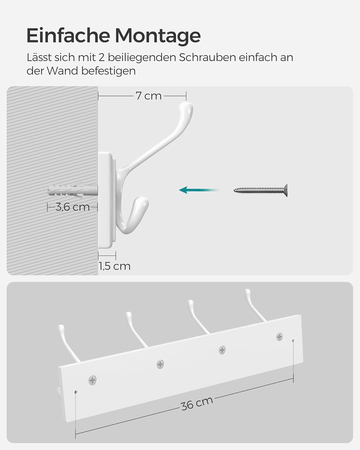 Platzsparende Aufbewahrung für Mäntel, Taschen und Schlüssel, Robuste Dreifachhaken tragen bis zu 5 kg pro Haken, Vormontiert für schnelle Wandbefestigung mit zwei Schrauben