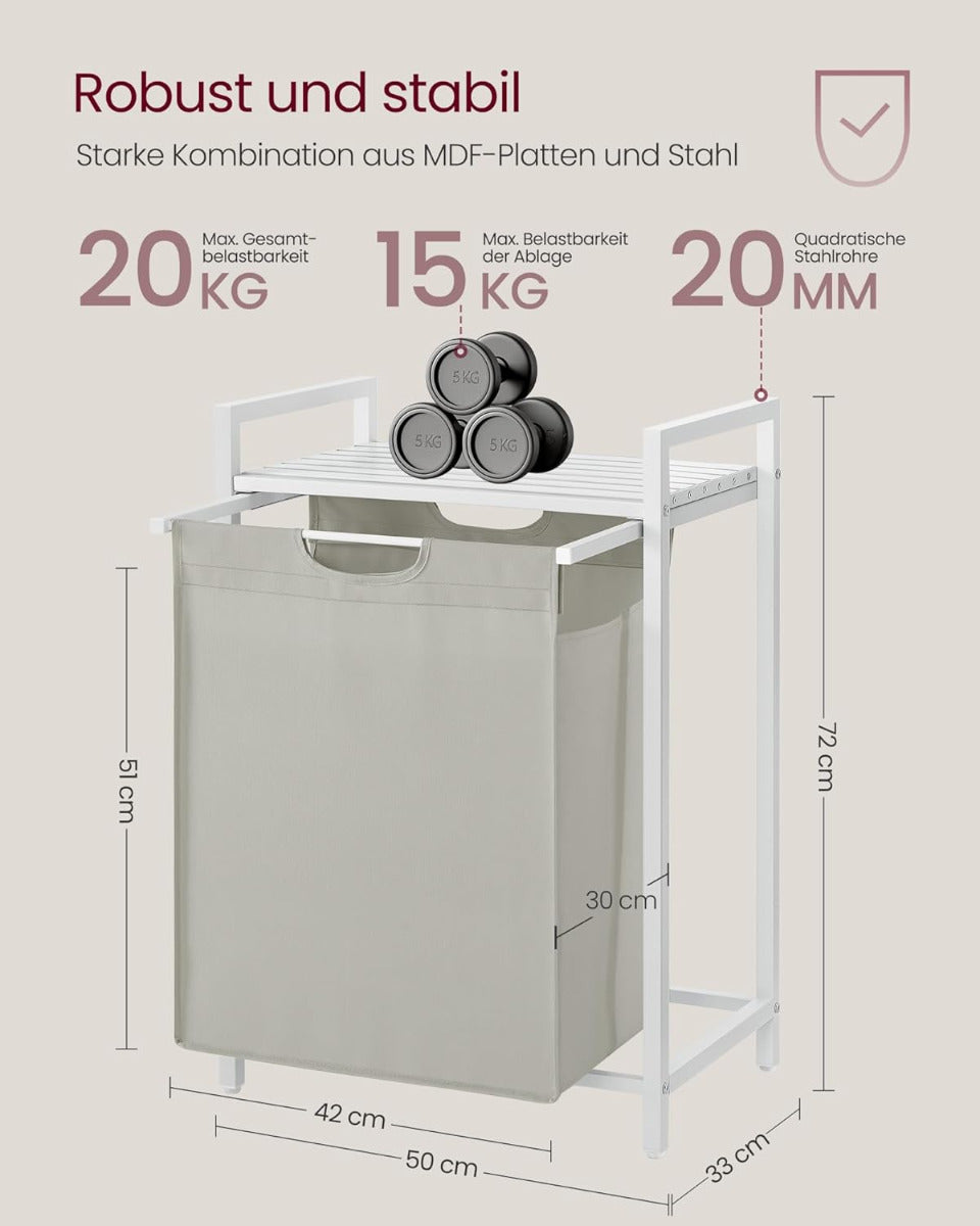 Entdecken Sie den SONGMICS Wäschekorb – die perfekte Lösung für Ihre Wäscheorganisation! Mit kompakten Massen von 50 x 33 x 72 cm bietet dieser Wäschesammler nicht nur viel Stauraum mit einem Fassungsvermögen von 65 Litern, sondern passt auch mühelos in enge Räume. Die praktische Ablagefläche ist ideal für Waschmittel und andere Utensilien, während das durchdachte Lamellen-Design für eine optimale Luftzirkulation sorgt und unangenehme Gerüche verhindert. Der abnehmbare Wäschesack ist nicht nur ausziehbar, sondern auch mit einer stabilen Kunststoff-Bodenplatte ausgestattet, die ein Durchhängen verhindert. Dank der Klettverschlüsse lässt sich der Sack mühelos herausziehen oder abnehmen – perfekt für den Transport zur Waschmaschine. Robustheit und Langlebigkeit stehen bei diesem Wäschekorb an erster Stelle. Die stabilen 2 x 2 cm Stahlrohre und MDF / Spanplatte-Platten garantieren eine hohe Belastbarkeit, während die Ablage bis zu 15 kg tragen kann. Zudem ist die Tasche wasserabweisend, und die verstellbaren Füsse sorgen für zusätzliche Stabilität. Vielseitig einsetzbar, ist der SONGMICS Wäschekorb ideal für Ihre Waschküche, Ihr Bad oder Ihr Schlafzimmer. Stellen Sie ihn dort auf, wo Sie zusätzlichen Stauraum benötigen, und wischen Sie Wasser auf der Ablage einfach mit einem Tuch ab. Machen Sie die Wäscheorganisation zum Kinderspiel – mit dem SONGMICS Wäschekorb!