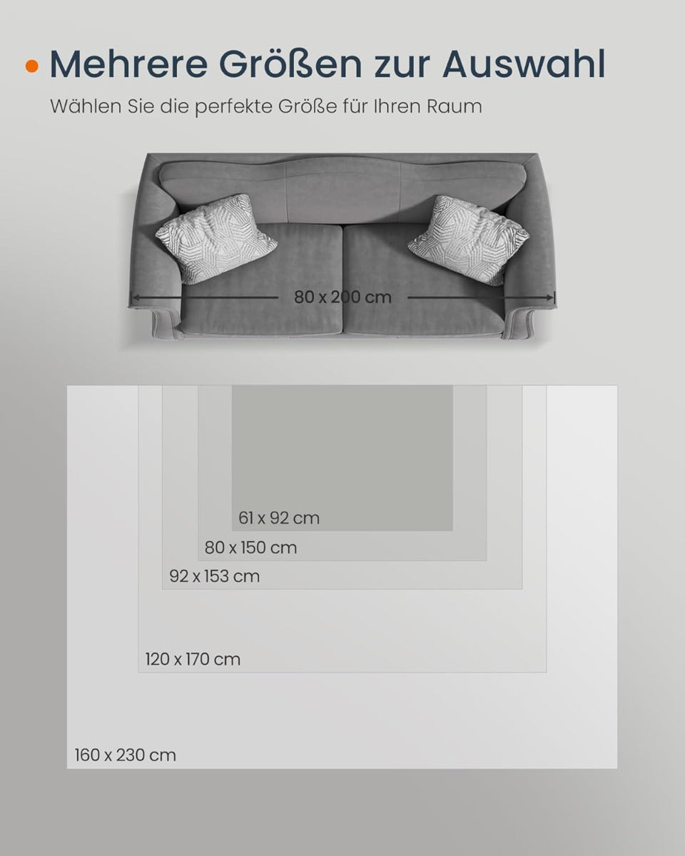Songmics Wohnzimmerteppich Rutschfest Vintage Grau – 120 × 170 cm Der Wohnzimmerteppich in Taubengrau verbindet stilvolles Vintage-Design mit moderner Funktionalität und sorgt für wohnliche Atmosphäre in jedem Raum. Mit seinen Massen von 120 × 170 cm eignet sich der Teppich ideal für das Wohnzimmer, Schlafzimmer, Homeoffice oder den Essbereich. Sein dezentes Muster im Vintage-Stil verleiht dem Raum zeitlosen Charme und fügt sich harmonisch in verschiedene Einrichtungsstile ein – von klassisch bis modern. Die Oberfläche aus hochwertiger Polyesterfaser in Kombination mit einer integrierten Filz-Zwischenlage sorgt für eine angenehme Weichheit und trittfreundlichen Komfort. Die fest vernähten Ränder beugen Ausfransen vor, erhöhen die Langlebigkeit und runden das stilvolle Gesamtbild ab. Besonderen Halt gewährleistet die rutschfeste TPR-Rückseite (thermoplastischer Gummi), die für Stabilität auf glatten Böden sorgt – ganz ohne zusätzliche Unterlage. Der Teppich ist maschinenwaschbar und lässt sich besonders leicht reinigen, was ihn ideal für Haushalte mit Kindern, Haustieren oder stark frequentierte Bereiche macht. Neben dem optischen Mehrwert schützt der Teppich empfindliche Böden zuverlässig vor Kratzern und Abnutzung. Durch seine hohe Materialdichte und das durchdachte Schichtsystem bietet er sowohl Komfort als auch Strapazierfähigkeit im Alltag. Die Highlights auf einen Blick: Vintage-Stil mit eleganten, zeitlosen Mustern Weiche Oberfläche durch hochwertige Polyesterfaser und Filz-Zwischenlage Rutschfeste TPR-Rückseite für sicheren Halt auf glatten Böden Maschinenwaschbar und pflegeleicht für dauerhafte Frische Fest vernähte Kanten gegen Ausfransen und für mehr Stabilität Bodenschonend – schützt vor Kratzern und Abnutzung Pflegeleicht & langlebig, ideal für stark genutzte Wohnbereiche Produktdetails: Farbe: Taubengrau Grösse: 120 × 170 cm Gewicht: ca. 3,2 kg Material: 700 g/m² Polyester (±15 g/m²) 200 g/m² Filz-Zwischenlage (±5 g/m²) 650 g/m² TPR-Rückseite (±10 g/m²)