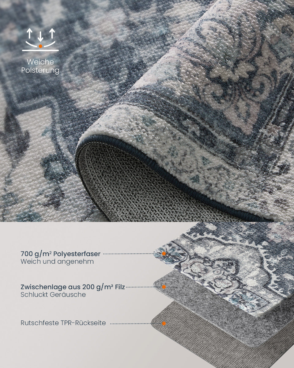Kunden schätzen den Songmics Wohnzimmerteppich für sein stilvolles Vintage-Design und die rutschfeste TPR-Rückseite, die Sicherheit auf glatten Böden bietet. Besonders beliebt sind die weiche Oberfläche aus hochwertiger Polyesterfaser und die pflegeleichten Eigenschaften, da der Teppich maschinenwaschbar ist. Die fest vernähten Kanten erhöhen die Langlebigkeit und schützen vor Ausfransen, während der Teppich empfindliche Böden vor Kratzern bewahrt. Ideal für stark genutzte Wohnbereiche, vereint er Komfort und Funktionalität.