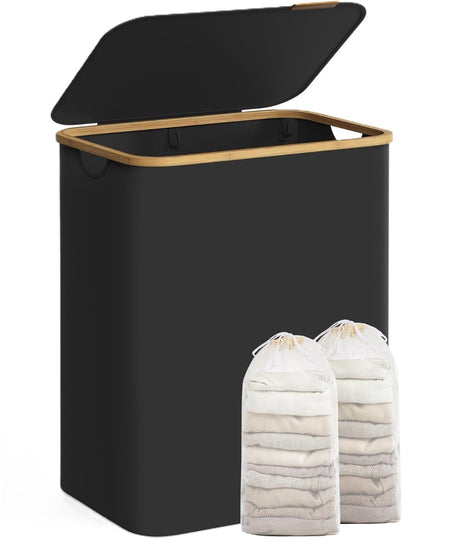 Wäschekorb 2 Fächer Bambus Griffe Schwarz