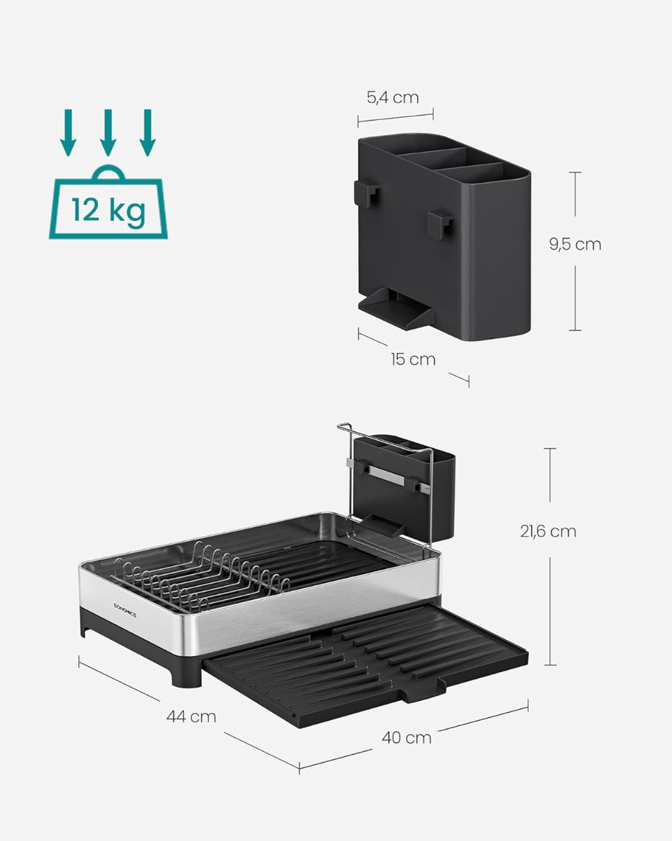 SONGMICS Abtropfgestell – erweiterbar, mit Utensilienhalter, Edelstahl, silbern-schwarz, rostfrei, für Teller, Schüsseln, Besteck und Tassen Das SONGMICS Abtropfgestell bietet dir eine platzsparende und durchdachte Lösung zum Trocknen von Geschirr – und überzeugt dabei mit einem modernen Look in Silbern-Schwarz. Dank des ausziehbaren Designs passt es sich flexibel deiner Arbeitsfläche an und schafft bei Bedarf zusätzlichen Platz. Gefertigt aus rostfreiem Edelstahl ist das Gestell nicht nur langlebig, sondern auch stabil – mit einer Tragkraft von bis zu 12 kg. Es bietet Platz für 9 Teller, 8 Tassen, 8 Schüsseln und über 25 Besteckteile, die bequem im separat integrierten Utensilienhalter verstaut werden können. Die leicht geneigte Abtropfschale mit Rillen sorgt dafür, dass überschüssiges Wasser direkt in die Spüle abläuft – für eine stets trockene Arbeitsplatte. Besonders praktisch: Die Auffangschale lässt sich ausziehen, um noch mehr Fläche für grösseres Geschirr oder Töpfe zu schaffen, und kann bei Nichtgebrauch wieder kompakt zusammengeschoben werden. Die Montage erfolgt in nur zwei einfachen Schritten – schnell, unkompliziert und ohne Werkzeug. SONGMICS liefert damit eine funktionale Lösung für mehr Ordnung in deiner Küche – auch auf kleinstem Raum. Die Highlights dieses Geschirrständers auf einen Blick: Hochwertiges Material: Hergestellt aus hochwertigem Edelstahl, korrosionsbeständig und rostfrei. Großes Fassungsvermögen: Hält 8 Schüsseln, 8 Tassen, 9 Teller und über 25 Utensilien mit Leichtigkeit. Effizienter Wasserablauf: Der Ablauf und die schräge Abtropfschale leiten überschüssiges Wasser einfach ab. Ausziehbare Abtropfschale: Für zusätzlichen Stauraum ausziehbar oder platzsparend zusammenschiebbar. Einfache Montage: In nur 2 einfachen Schritten zusammengebaut. Produktdetails: Farbe: Silbern-Schwarz Material: Edelstahl, PP-Kunststoff (Polypropylen) Größe: (25-44) x 40 x 21,6 cm (T x B x H) Gewicht: 1,2 kg Max. statische Belastbarkeit insgesamt: 12 kg Lieferumfang: 1 x Abtropfgestell 1 x Anleitung